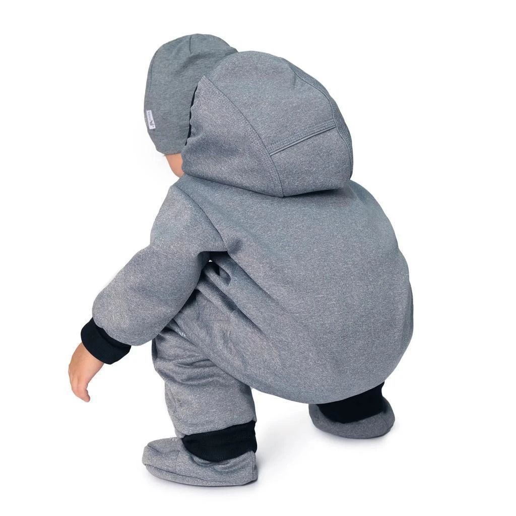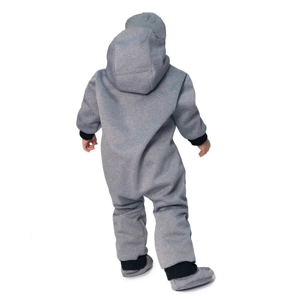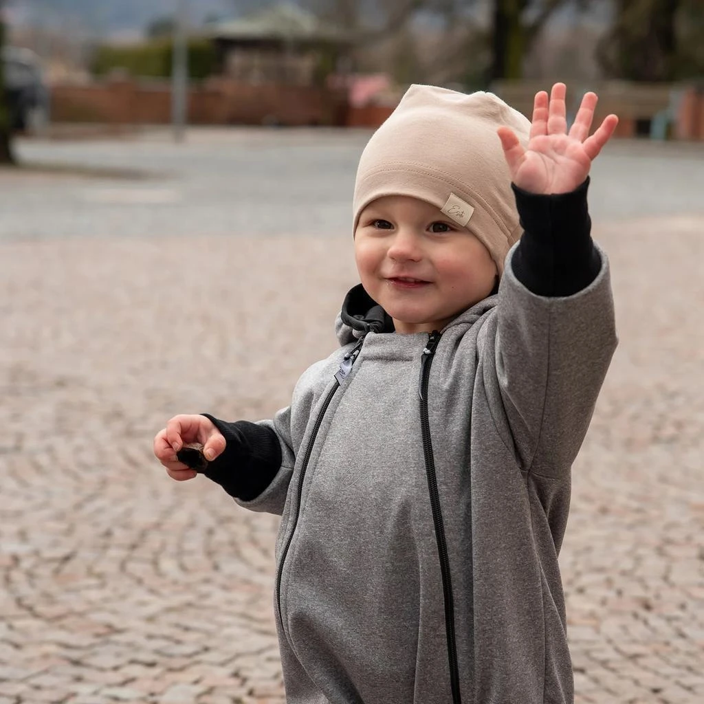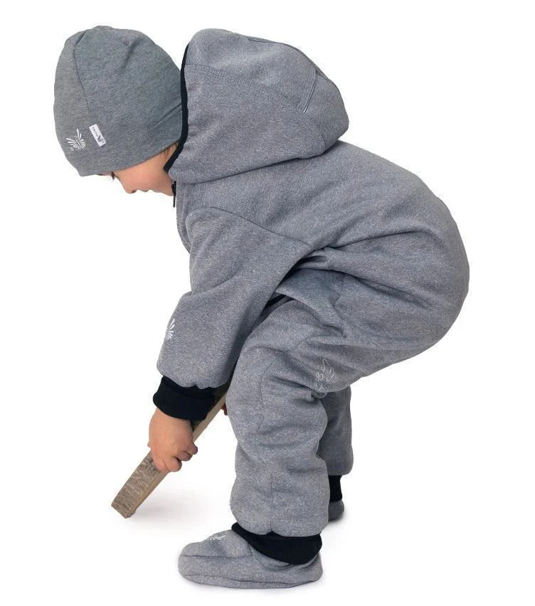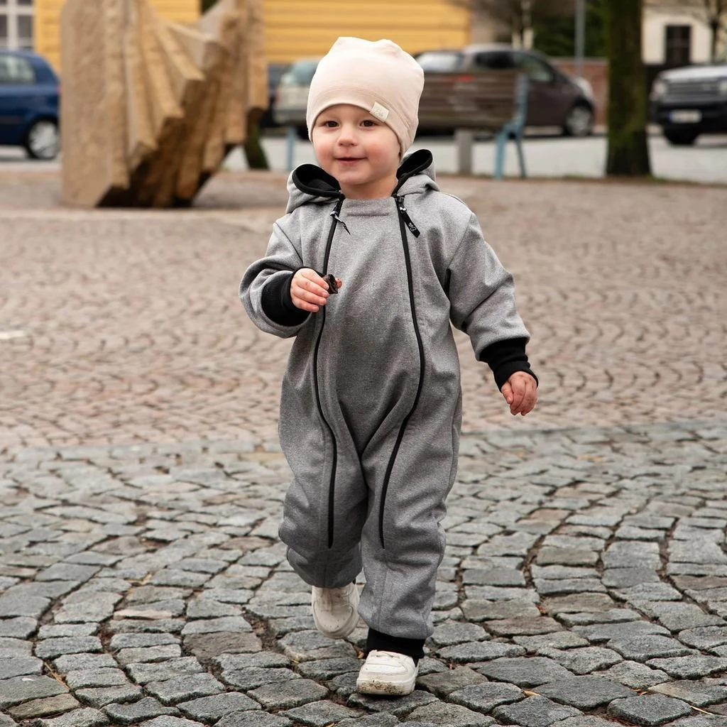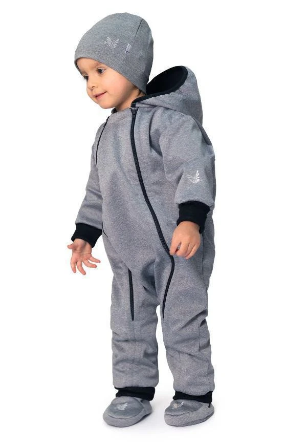 Do detailu premyslená, maximálne pohodlná, funkčná, dvojveľkostná detská handmade kombinéza zo softshellu Šedý melír. Precízne ručné práce z podhorí Orlických hôr.
