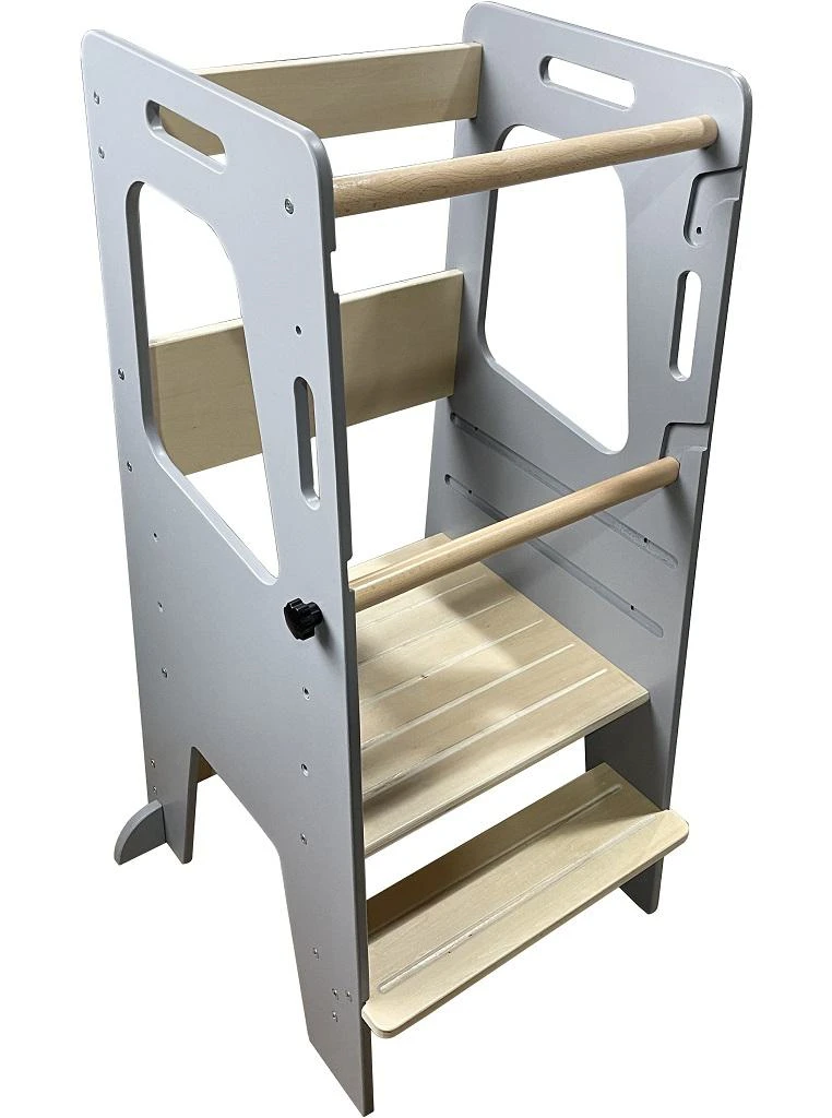 Učiaca veža je viacúčelový a funkčný kus nábytku, ktorý podporuje samostatnosť a motorické zručnosti detí. Vďaka šikovnému tvaru a ohrádke okolo stojacej plochy sa dieťa cíti stabilne a bezpečne, zatiaľ čo má rodič neustály dohľad. Vežu ľahko priskrutkujete ku kuchynskej linke alebo pracovnej doske tak, aby bola vždy pevne pri prekážke oproti schodíku.