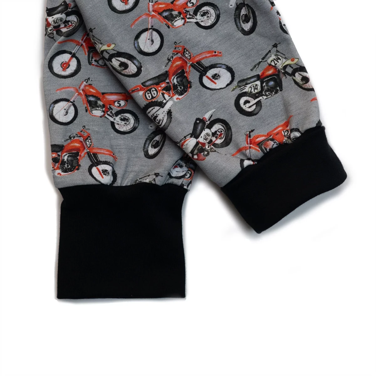 Rastúce detské tepláky Motorky. Osvedčený rastúci strih. Pružné tepláky s vysokým nápletom v páse aj pri nohaviciach. Vyskúšajte kvalitné detské oblečenie od ESITO.