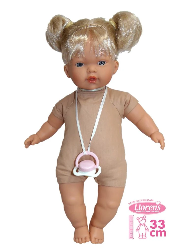 Veľkosť bábiky 33 cm. Ručne vyrobené v Španielsku, balené v igelitovom obale. Odporúčaný vek od 3 rokov. Tento model je bez oblečenia a preto odporúčame k bábike dokúpiť originálne oblečenie z ponuky Llorens pre bábiky veľkosti 33 cm.