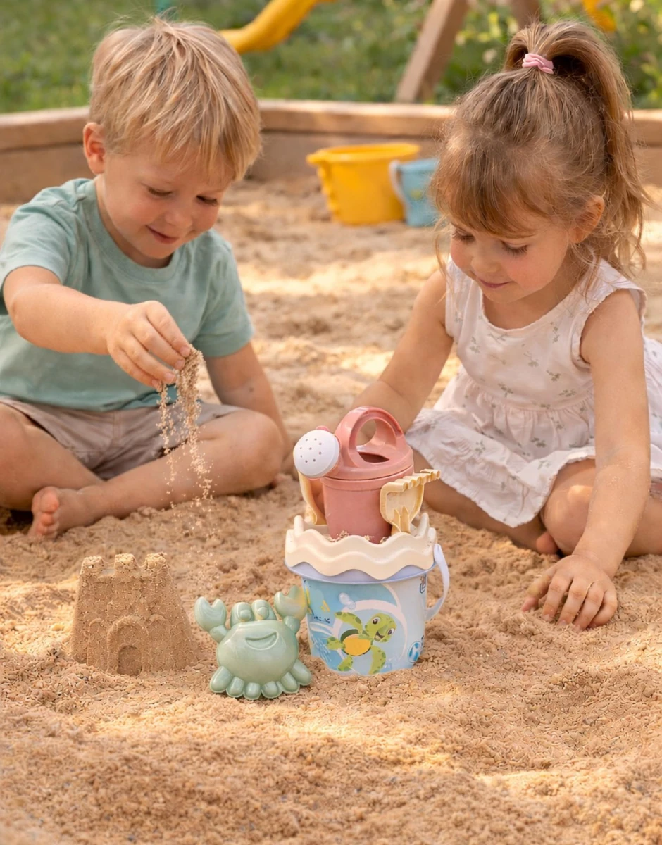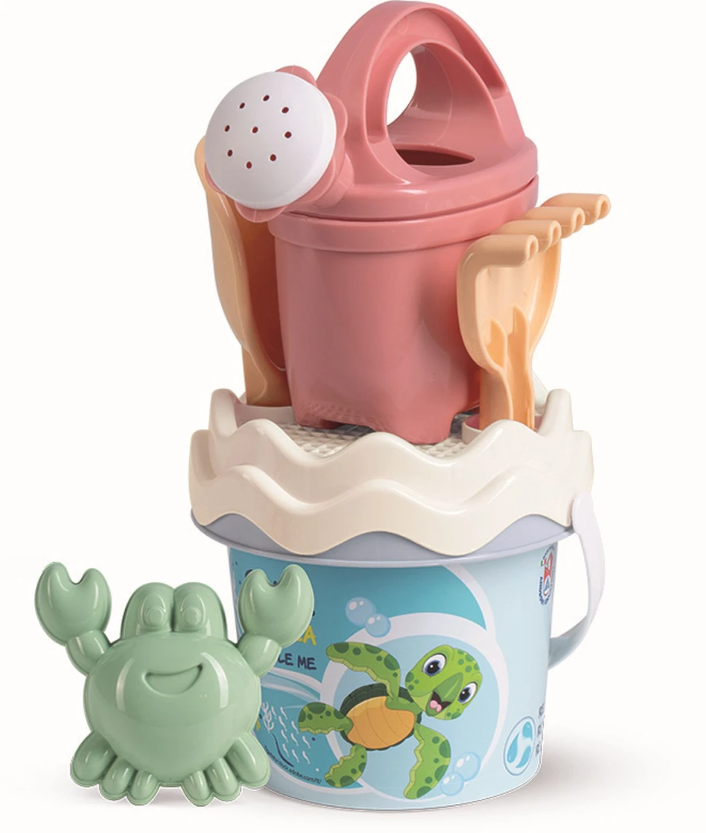 Praktická 6 dielna sada na piesok v jemných pastelových farbách je ideálna pre zábavu na pieskovisku, záhrade aj na pláži. Súprava je vyrobená z kvalitných recyklovaných plastov v Taliansku, vďaka čomu je šetrná k životnému prostrediu a zároveň odolná pri každodennom používaní. Deti si užijú veľa zábavy pri stavaní báboviek, hrabaní piesku alebo zalievaní pomocou kanvičky.