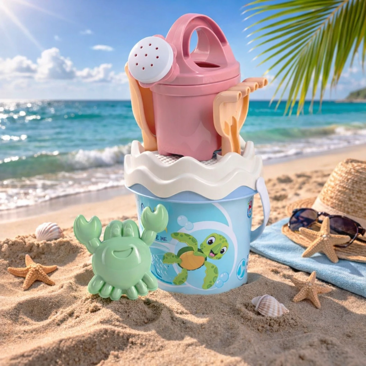 Sada obsahuje vedierko, kanvičku s objemom 0,5 l, sitko, lopatku, hrabličky a tvorítko v tvare morského kraba. Veľkosť náradia je prispôsobená detským rukám, takže sa deťom dobre drží a ľahko sa s nimi pracuje.