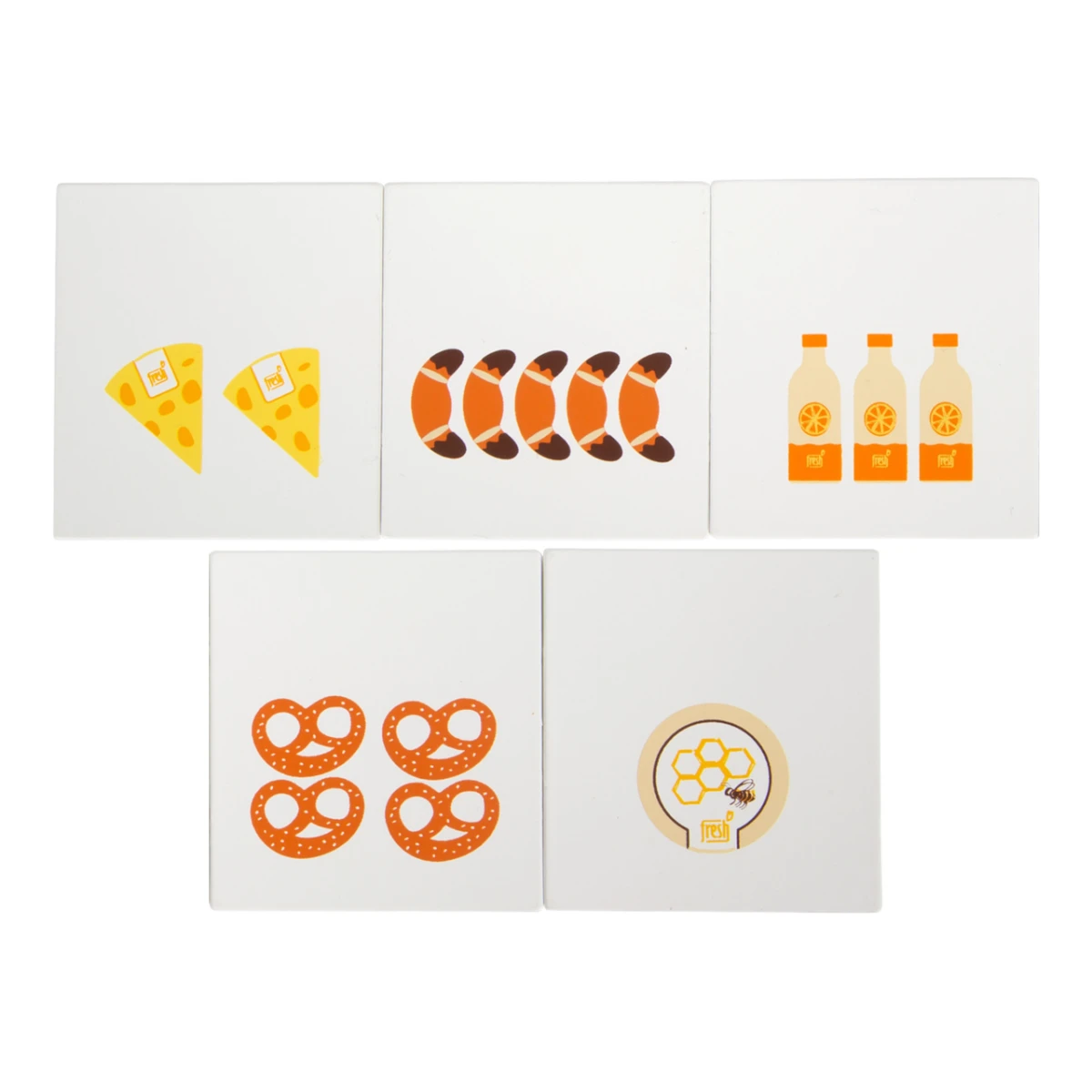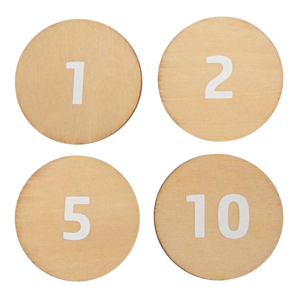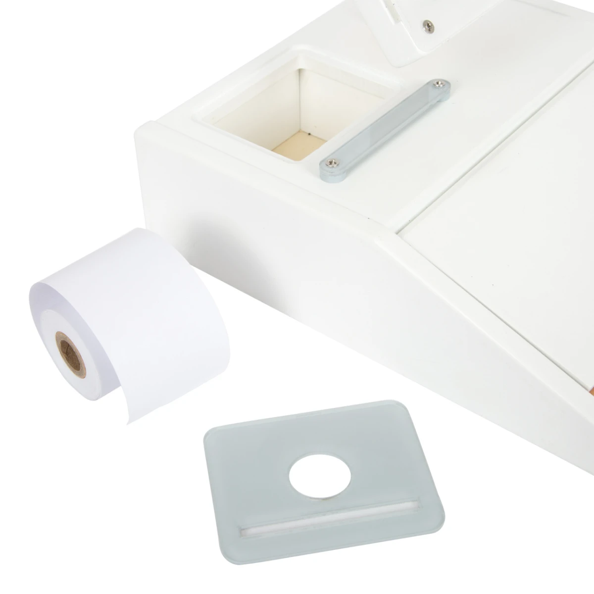 - čítačka čiarových kódov, trhacia rola účteniek, otočný monitor, fungujúca kalkulačka, platobná karta, karty produktov, 15 obojstranných drevených mincí