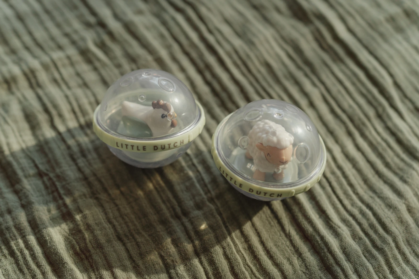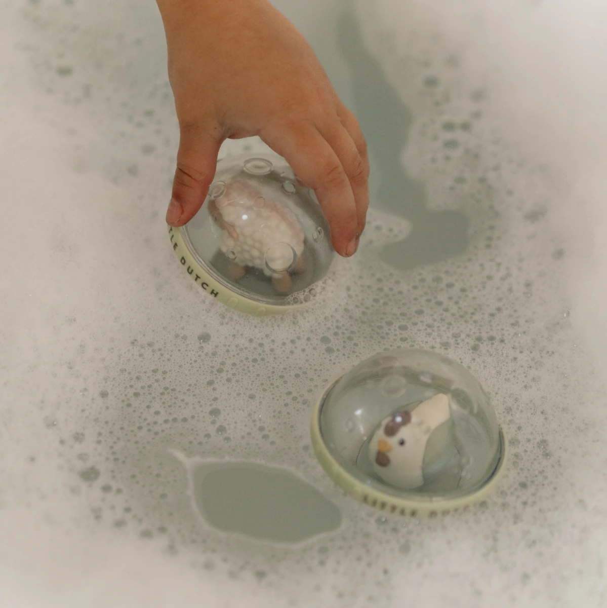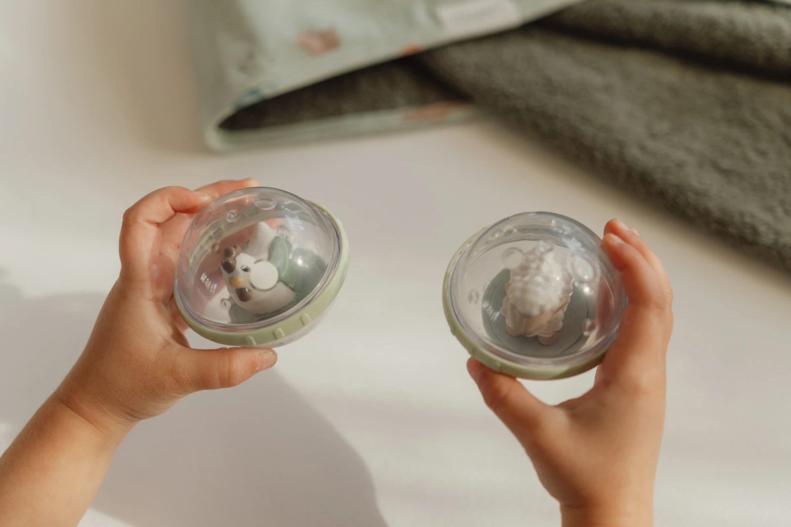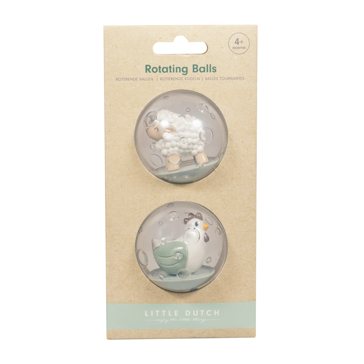 Dve priehľadné loptičky s pohyblivou hračkou vo vnútri v podobe ovečky a sliepočky sú skvelou hračkou do kúpeľa aj na hraciu deku.