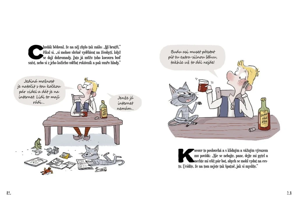 Kocúr nie je práve dedičstvo na pohľadanie. Lenže keď ten kocúr vie rozprávať, dokáže vám zjednávať napríklad... napríklad celé kráľovstvo. A ešte vám poradia, kde sa dajú zohnať parádne topánky. Hovoríte si, čo je to za rozprávku? To je rozprávková pohroma! Aj hrdinovia z klasických rozprávok chcú držať krok s dobou. Prečítajte si známu rozprávku s vtipnými ilustráciami aj komentármi, ktoré pobavia vás aj vaše deti. Napokon kniha, ktorú si budete chcieť čítať každý večer!