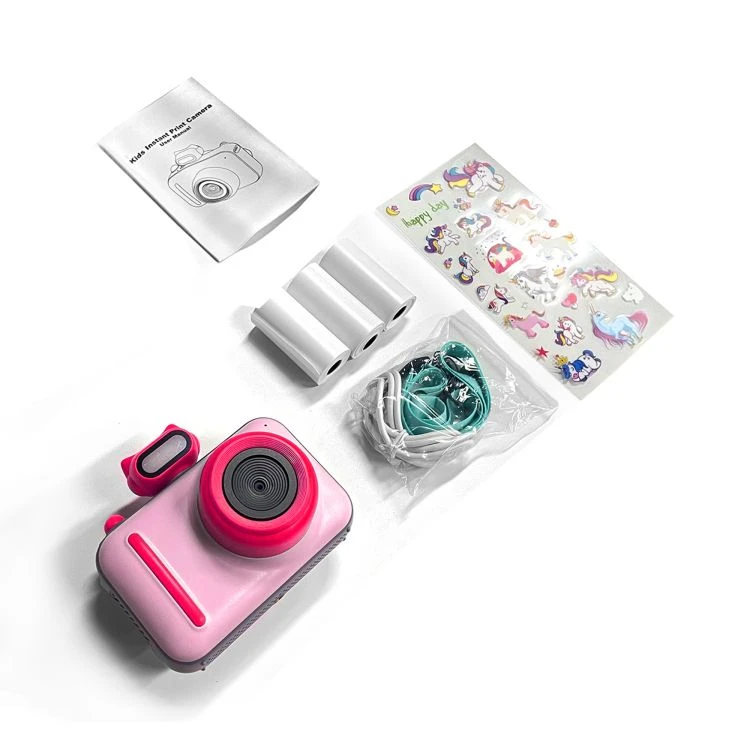 Ružový foťák s termotlačou obsahuje: ružový fotoaparát s digitálnym zoomom, 16 GB pamäťovú kartu, USB kábel na nabíjanie, 3 cievky s termopapierom, šnúrku na krk, druhý objektív pre selfie, samolepky a príručku so základmi fotenia.
