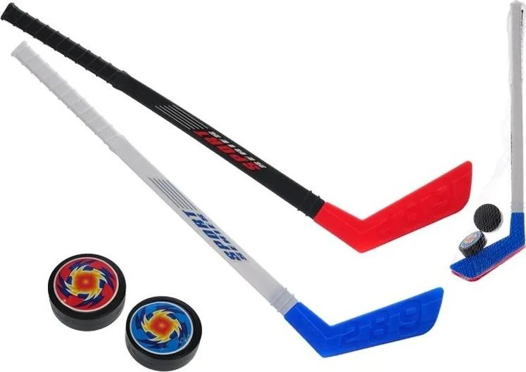 Dve plastové hokejky v sieťke s dĺžkou cca 57 cm, každá v inej farbe a 2 puky. Vek 3+
