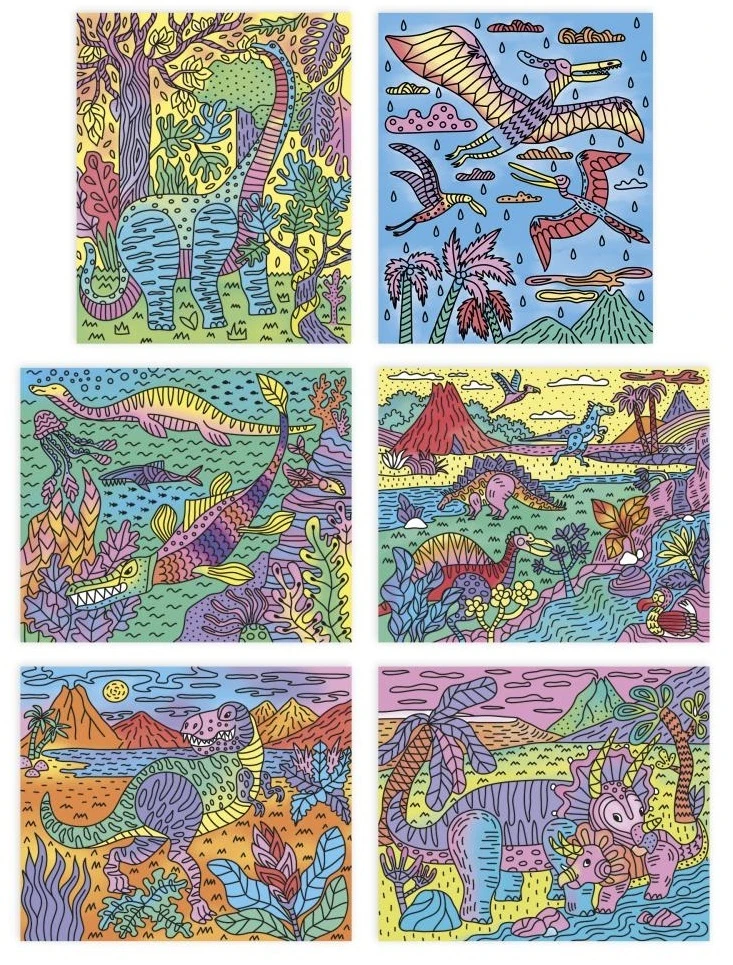 Súčasťou tejto sady je 6 magických malieb. Produkt s motívom dinosaurov zobrazuje druhy, ktoré si deti určite zamilujú! Naučia sa dávať pozor, aby sa farby navzájom nemiešali. Vysvetľujúca brožúrka im pomôže uviesť ich krásne obrazy do života, krok za krokom! A to nie je všetko... Krabica sa premení na rám, ktorým orámujete svoje nádherné výtvory! Dokončenie každého obrázku trvá približne 1 hodinu.