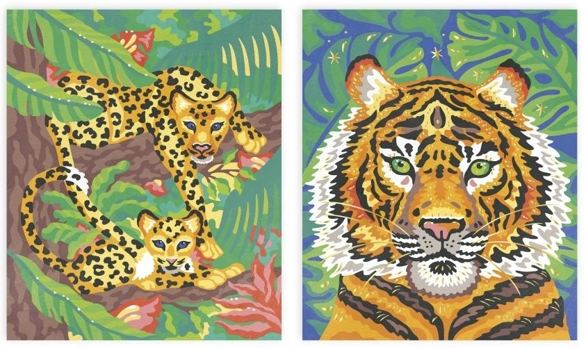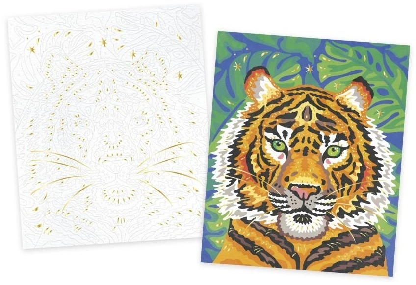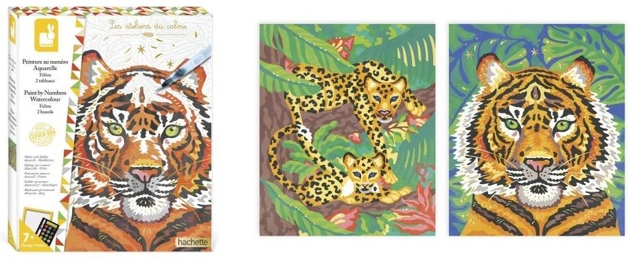 Paleta 15 akvarelových farieb, hubka a vodný štetec robia z tejto sady originálnu a ucelenú aktivitu. Vysvetľujúca brožúrka označuje farbu zodpovedajúcu každému číslu. Jeden z dvoch obrazov sa môže pochváliť pozlátenými efektmi, ktoré výtvory ešte viac skrášľujú. Ďalší praktický nápad: škatuľa sa premení na stojan, aby bola činnosť jednoduchšia!