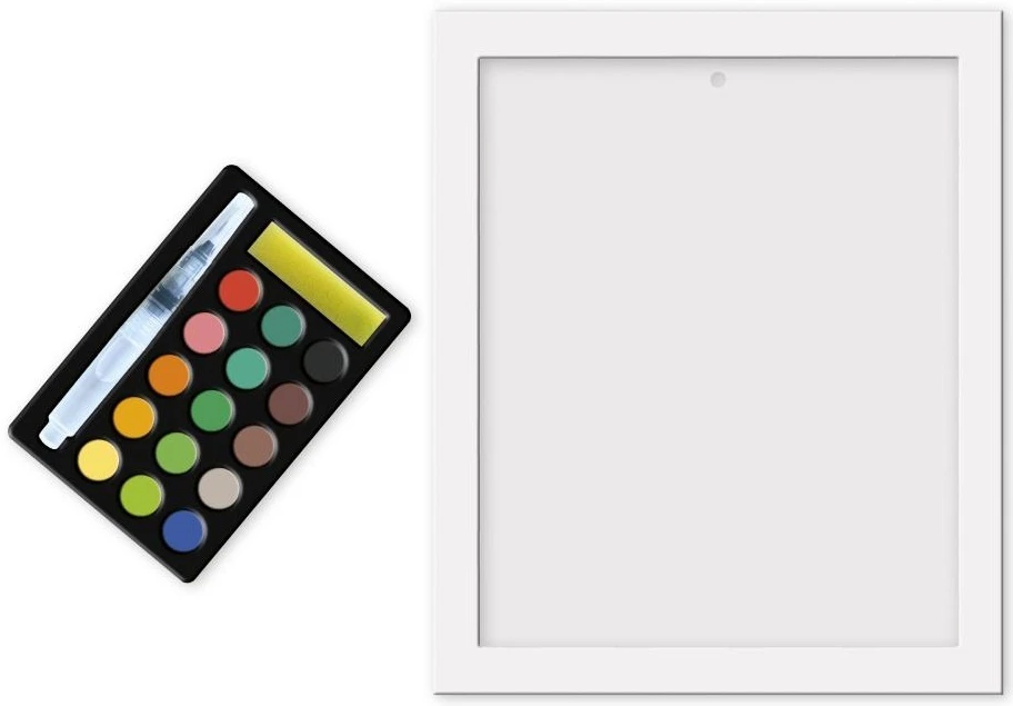 Obsah: paleta s vodovými farbami, plniteľný štetec, 2 obrázky na vymaľovanie (1 so zlatou potlačou), rám.