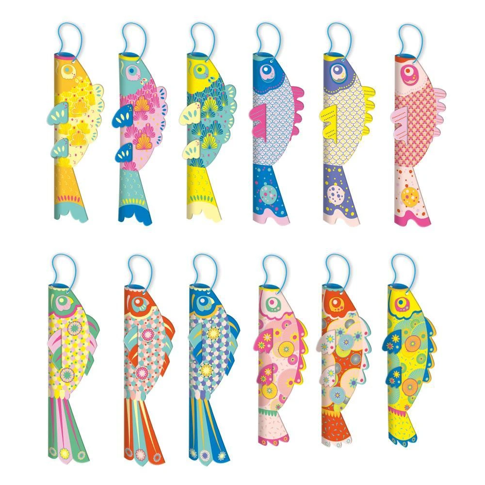 Aká pekná pestrofarebná ryba! Táto kreatívna sada umožňuje deťom od 7 rokov a viac vytvoriť 12 závesných papierových rýb, ideálny na výrobu girlandy na morskú tému alebo ako malé prekvapenie, napríklad 1. apríla!
