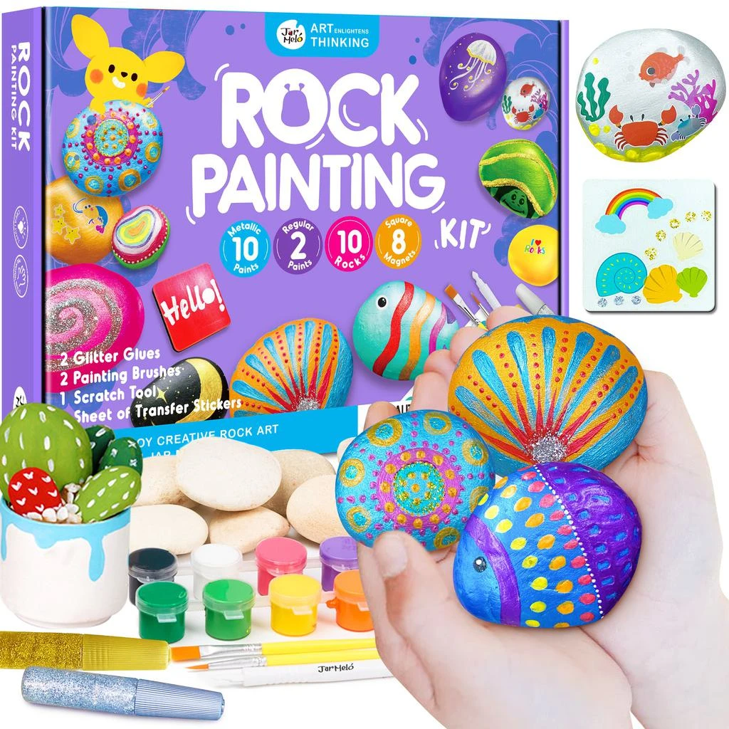 10 hladkých prírodných kamienkov rôznych tvarov12 akrylových farieb (10 metalických a 2 základné odtiene) + 2 tuby trblietavého lepidla pre extra efekt, 2 štetce – hrubšie a jemnejšie pre detaily aj plochy + nástroj na škrabanie, 8 magnetiek na chladničku. Farebné nálepky.