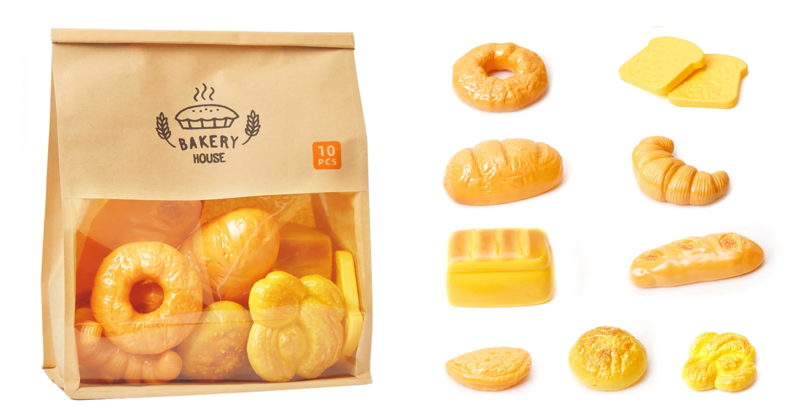 Rôzne druhy pečiva rozširujú možnosti hry a umožňujú deťom hrať sa na rôzne situácie (raňajky, olovrant, návšteva pekárne).