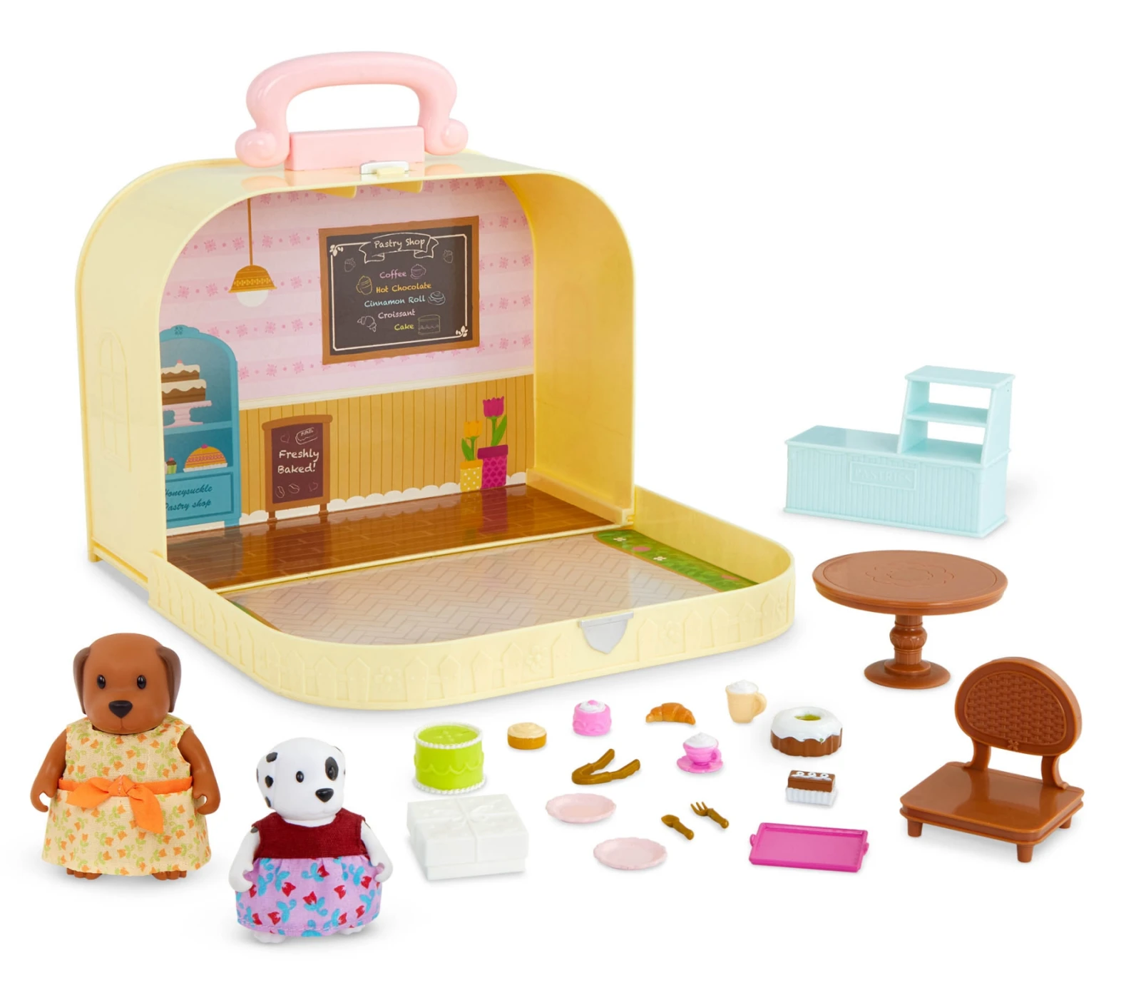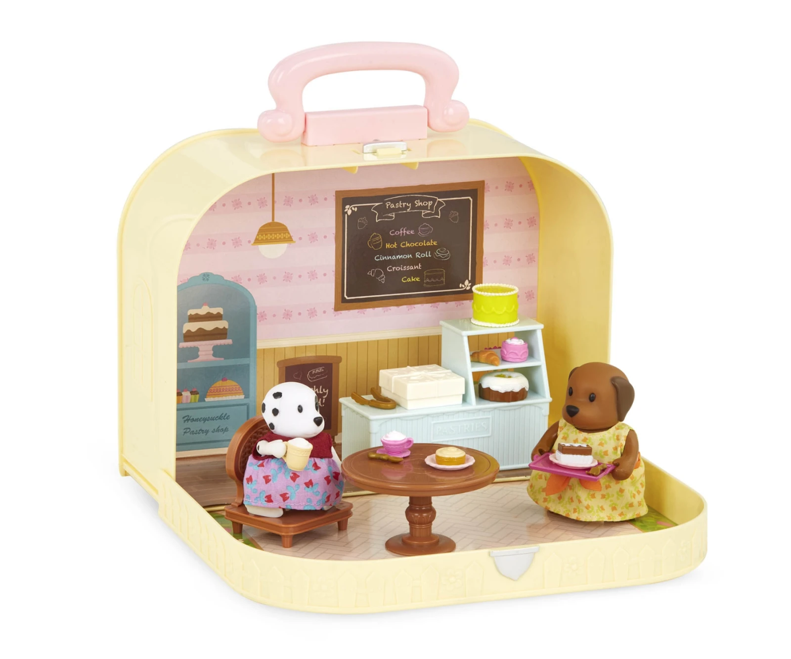 22-dielna sada obsahuje kufrík, 2 postavičky psíkov, pult, stôl, stoličku, krabičku, horúcu čokoládu, vysokú tortu, tortu, 1 škoricovú rolku, croissant, čokoládovú tortu, tácku, 2 taniere, vidličku, lyžicu, kliešte, kliešť,