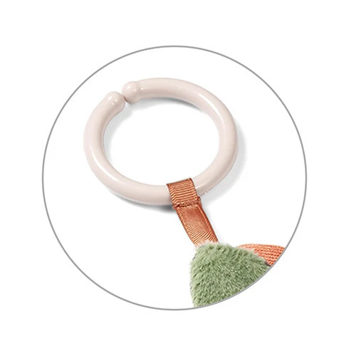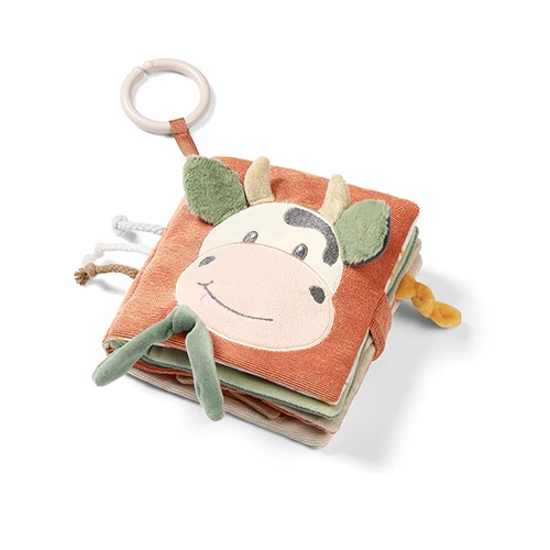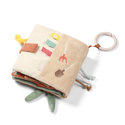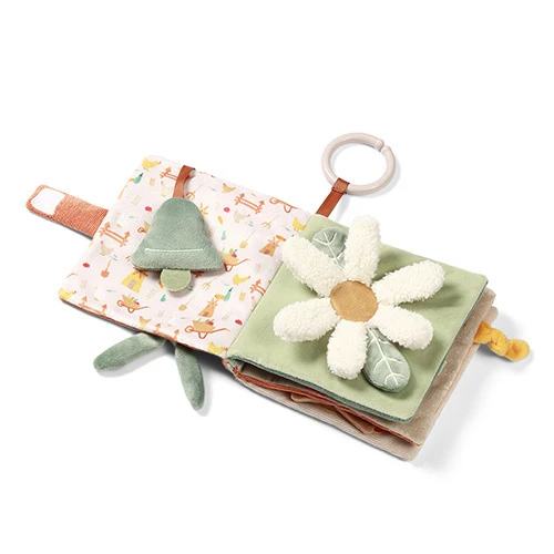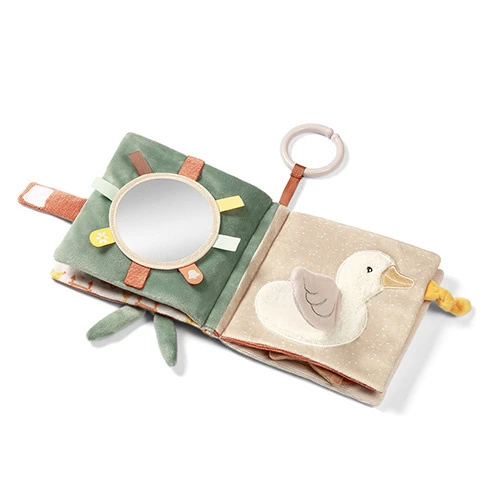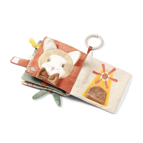 Jednotlivé stránky obsahujú šuštiace prvky vydávajúce zaujímavé zvuky, jemnú hrkálkovú výplň podporujúcu trepanie a bezpečné zrkadlo umožňujúce objavovanie vlastného odrazu. Farebné stužky a uzlíky podporujú učenie správneho úchopu.