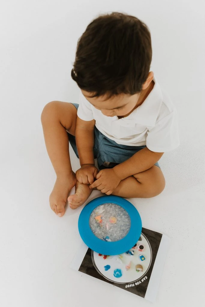 Mäkký silikónový disk s priehľadným okienkom ukrýva drobné nezávadné figúrky a guličky, ktoré môžu deti stláčať, tlačiť, posúvať, hľadať, naťahovať aj pátrať po skrytých pokladoch. Obľúbená hra „hľadaj a nájdi!“ tak dostáva nový rozmer a nikdy sa neomrzí. Hračka je ideálna pre malé ručičky, ktoré milujú stláčanie, objavovanie a skúmanie dotykom.