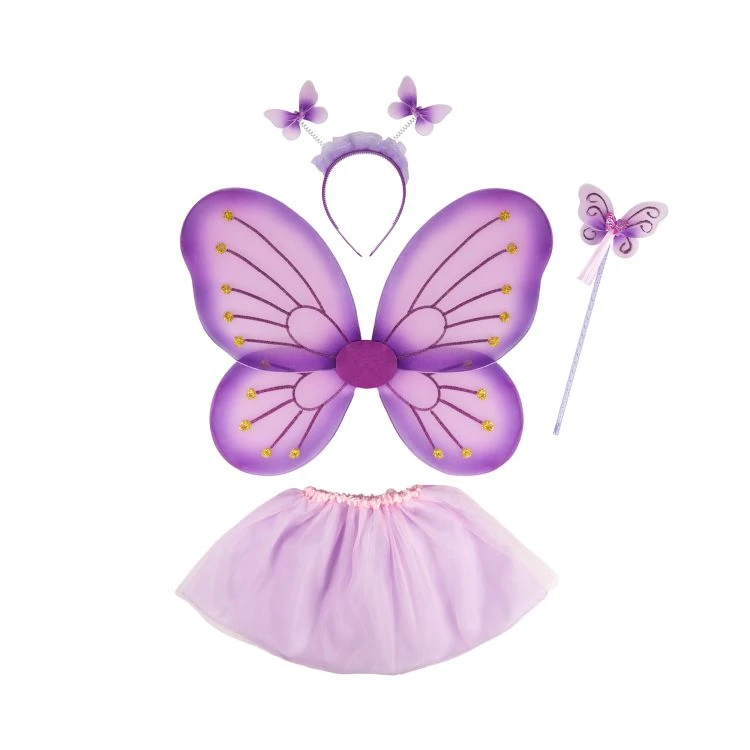 Tento detský set je ladený do ružovej a fialovej farby a obsahuje čelenku s dvoma motýlikami, prútik s motýľom, krídla s glitrovou maľbou a vrstvenú tylovú sukňu.