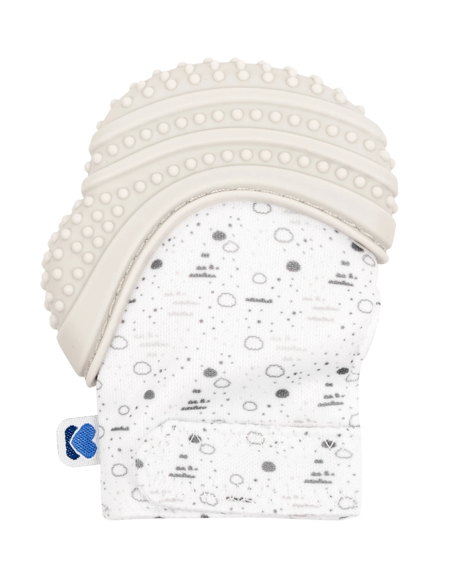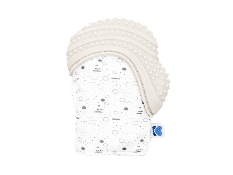 Mäkká rukavička s hornou časťou z jemného potravinárskeho silikónu pomáha chrániť dieťa pred poškriabaním vlastnými nechtíkmi. Vďaka silikónovej časti s jemnými výstupkami funguje aj ako hryzátko, ktoré pomáha dieťaťu pri prerezávaní prvých zúbkov. Šuštiaci materiál upúta pozornosť dieťaťa.