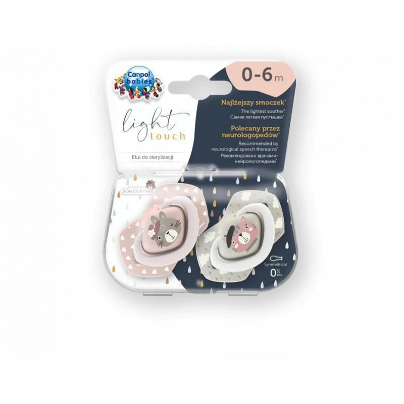 Cumlíky Light touch sú malé a ľahké - jedná sa o najľahšie cumlíky z ponuky od značky Canpol babies. Sú určené pre deti vo veku 0-6 mesiacov, neobsahujú BPA av balení, v podobe sterilizačnej kapsule, sú umiestnené 2 ks cumlíkov.