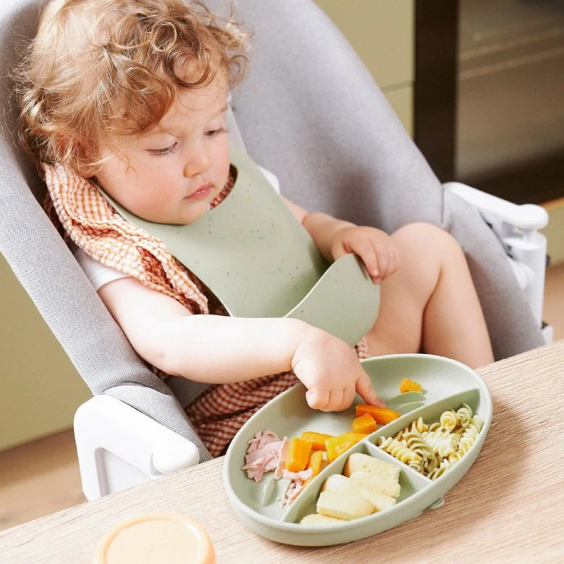 - mäkký, silikónový tanier s 3 oddelenými priehradkami