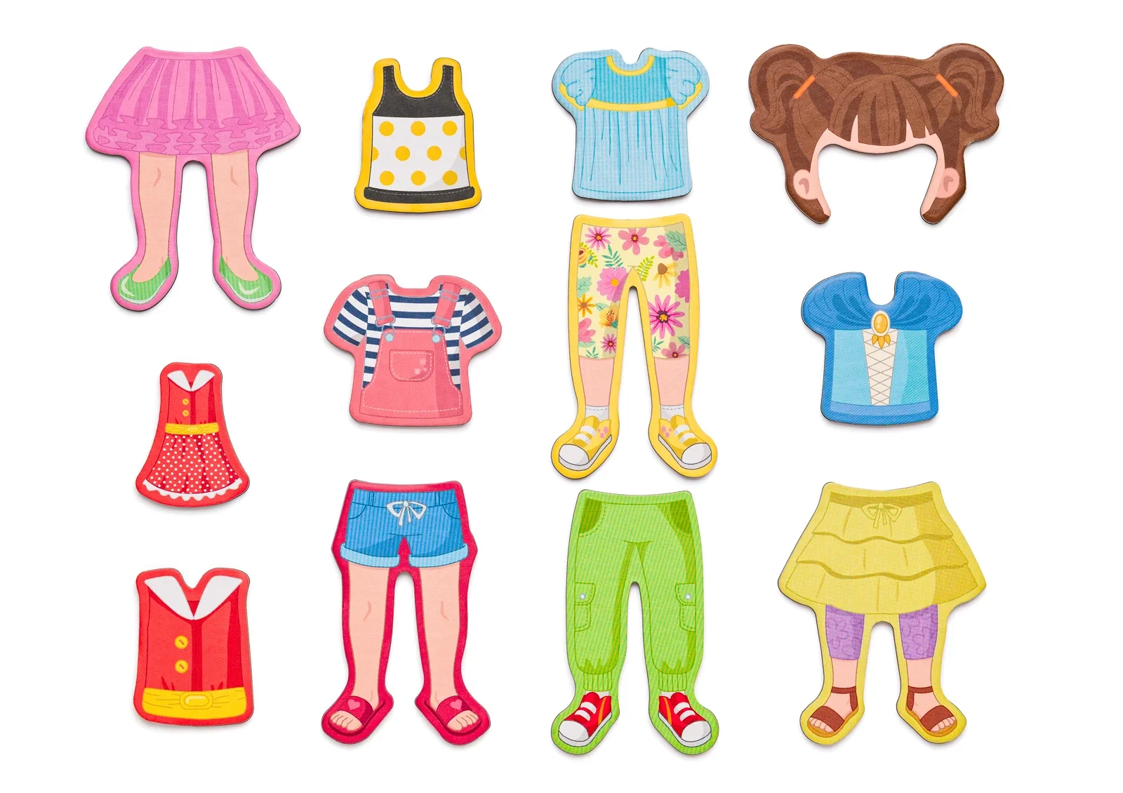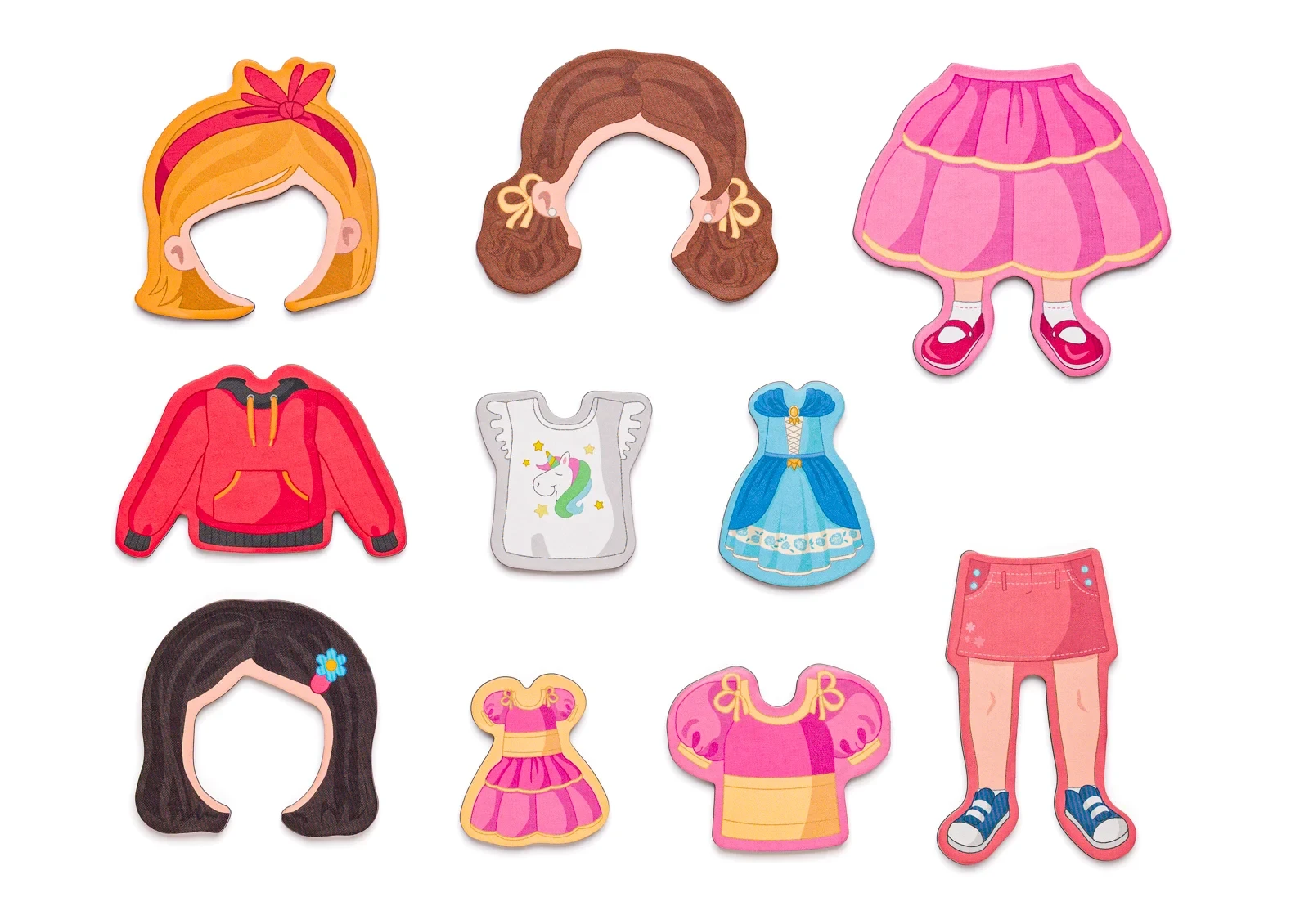 Kombinuj tričká, sukne, nohavice, šaty aj účesy - a nezabudni obliecť aj ich bábiku! Inšpiruj sa priloženými kartičkami s módnymi tipmi. Z druhej strany magnetického veka sa nachádza plocha na maľovanie. Maľovať môžete priloženou mazacou fixkou, ktorá je zároveň vybavená hubkou. Maľujte znova a znova. Magnetické tvary je možné priložiť z oboch strán magnetického veka.