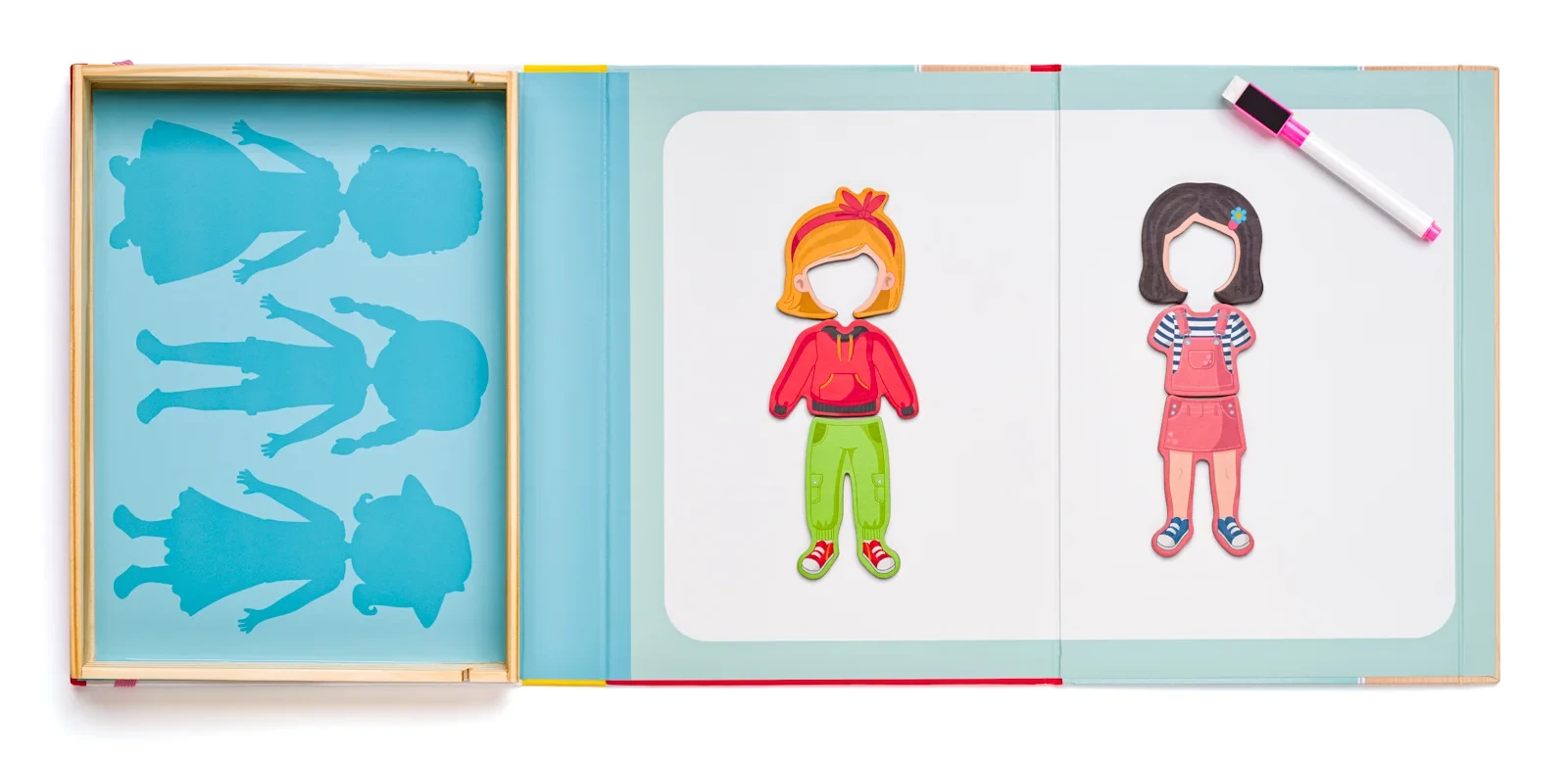 Štýlová zábava pre malé módne návrhárky! Otvorte drevenú krabičku plnú magnetických oblečkov a vytvorte dokonalé outfity pre dve dievčatká vyobrazené na magnetickom veku.