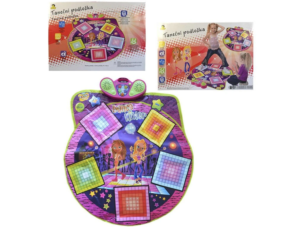 Hracia podložka tanečná. Podložka reaguje na dotyk, hrá hudbu a svieti 5 farebných svetiel, ktoré taktiež vydávajú špeciálne zvukové efekty. Je možné ju prepojiť s MP prehrávačom - obsahuje prepojovací kábel. Rozmer podložky 93 x 91 cm. Rozmer balenia cca 47 x 33 x 7,5 cm. Napájanie na 3x AA batérie (nie sú súčasťou balenia). Vek 3+.