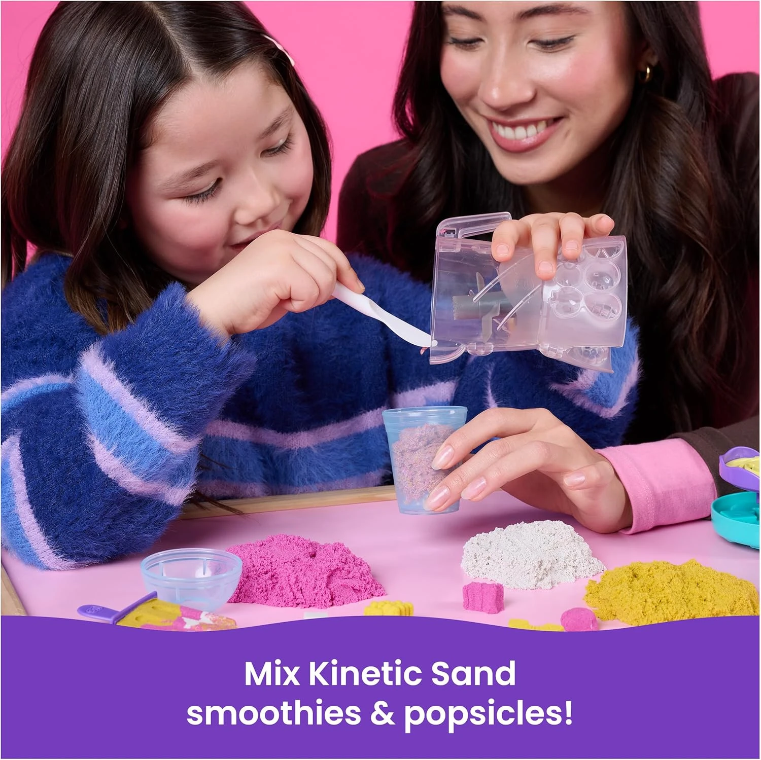 Vytvárajte ovocné dobroty so sadou Kinetic Sand Smoothie Mixer. S touto zábavnou sadou môžu deti tvarovať, vrstviť, miešať, krájať a stláčať svoje vlastné smoothie a nanuky a rozvíjať tak kreativitu aj predstavivosť.