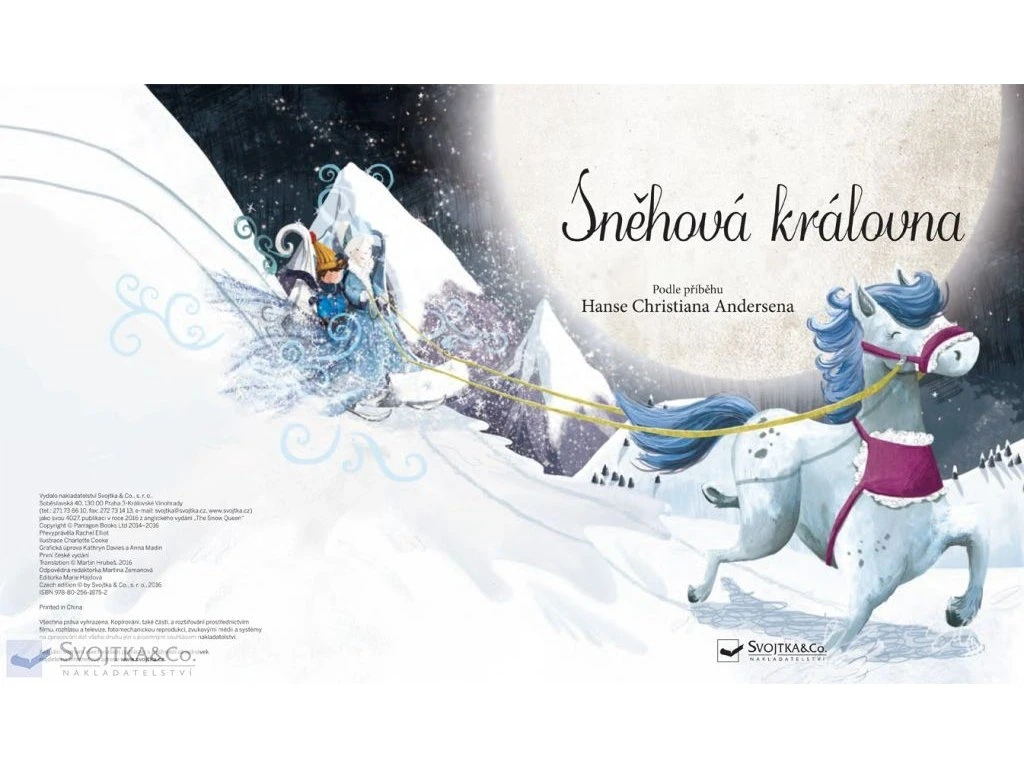 Kedysi dávno stvoril jeden zlý škriatok kúzelné zrkadlo. Všetko sa v ňom zobrazovalo škaredé, pokrivené a zlé. Jedného dňa niekoľko ľahkomyseľných škriatkov kúzelné zrkadlo ukradlo, vykĺzlo im a roztrieštilo sa na tisíc čriepkov... Ako táto rozprávka pokračovala a kto bola Snehová kráľovná, sa dozviete v tejto knižke, ktorá obsahuje jednu z najkrajších a najznámejších rozprávok slávneho. Pohodlne sa teda posaďte a pustite sa so svojimi deťmi do prezerania krásnych ilustrácií a čítania napínavého príbehu o Snehovej kráľovnej!