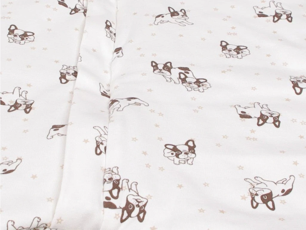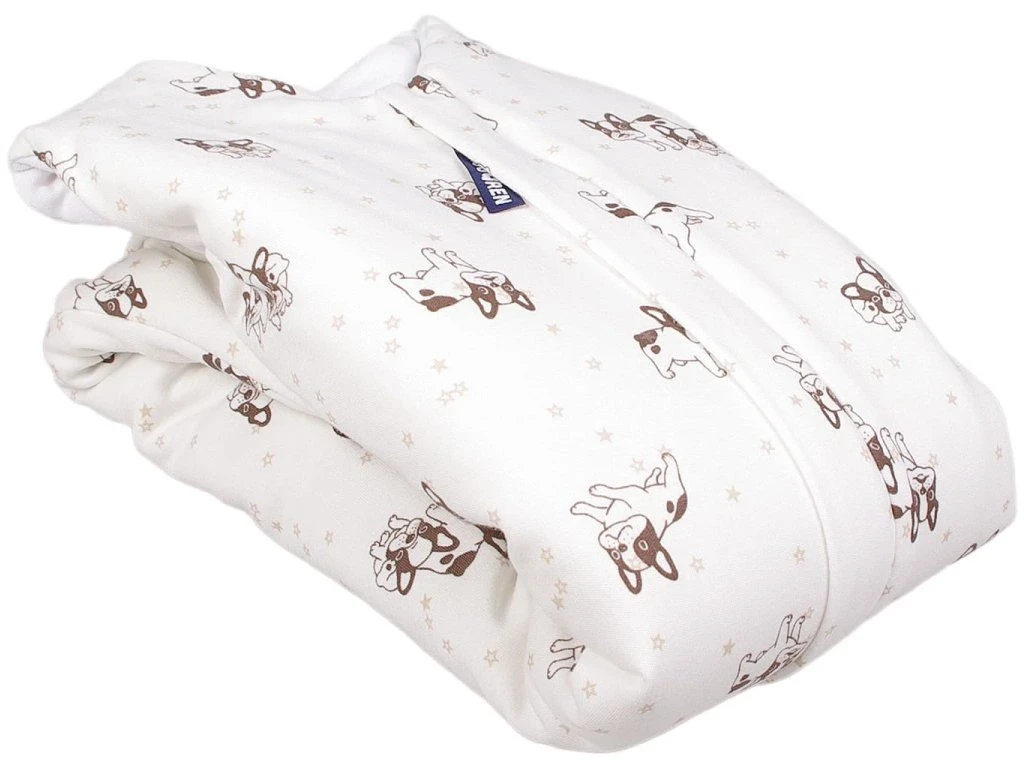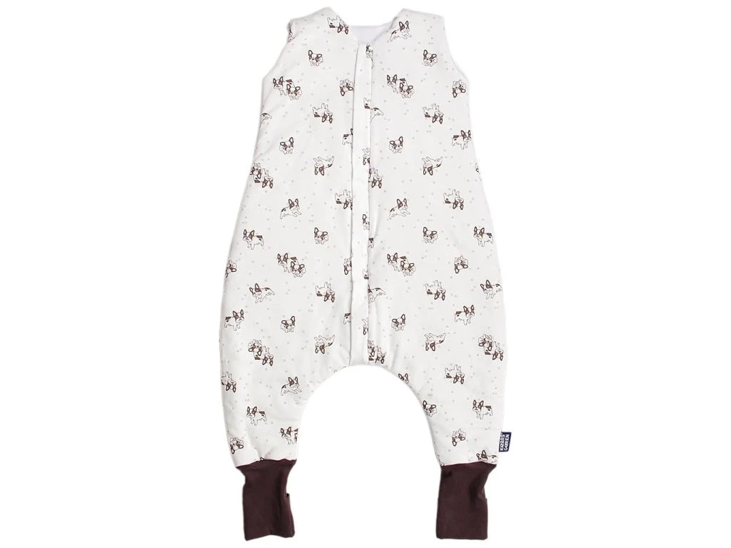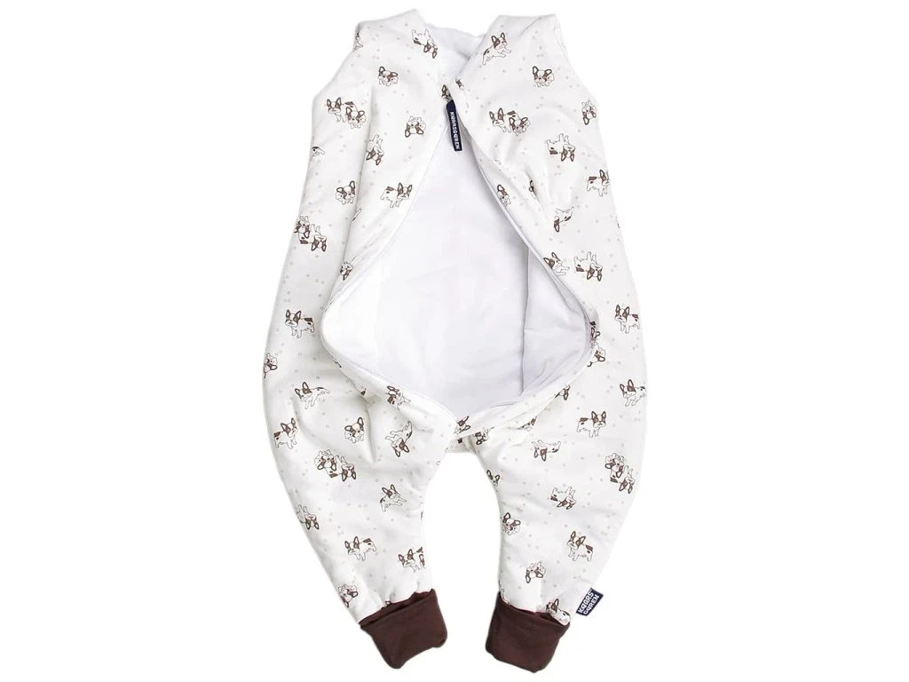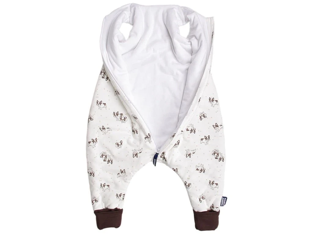 Nožičkový spací vak s motívom buldočkov je pohodlný na spanie aj ako celodenný overal. Vďaka otvorom na nohy umožňuje voľný pohyb aktívnym deťom.