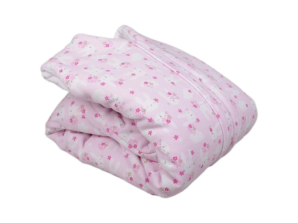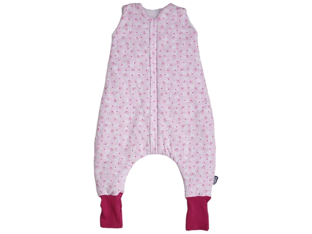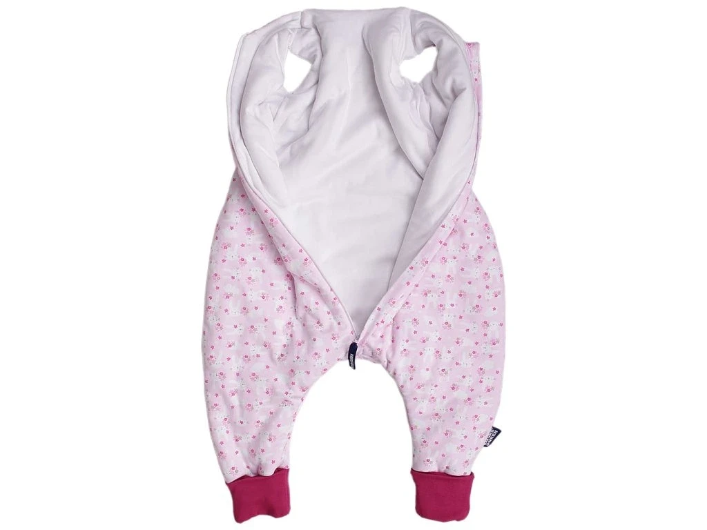 Nožičkový spací vak v jemne ružovom prevedení so zajačikmi je ideálny pre pokojný spánok aj pohodlné denné nosenie. Vďaka nohaviciam poskytuje dieťaťu voľnosť a zároveň príjemné teplo.
