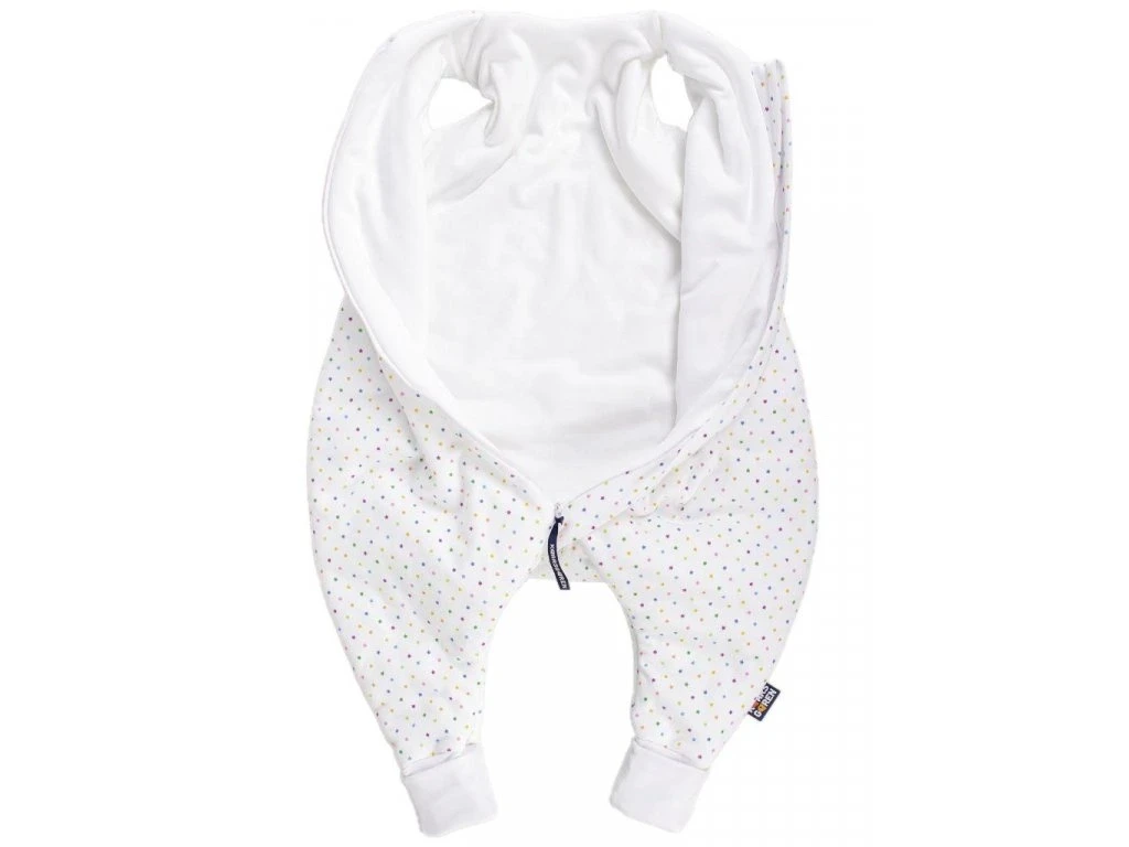 Spací vak pre novonarodené bábätko s otvormi pre nohy v šedej farbe as motívom bodiek, bábätko v ňom môže voľne kopať nožičkami.