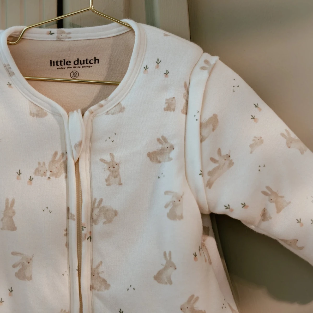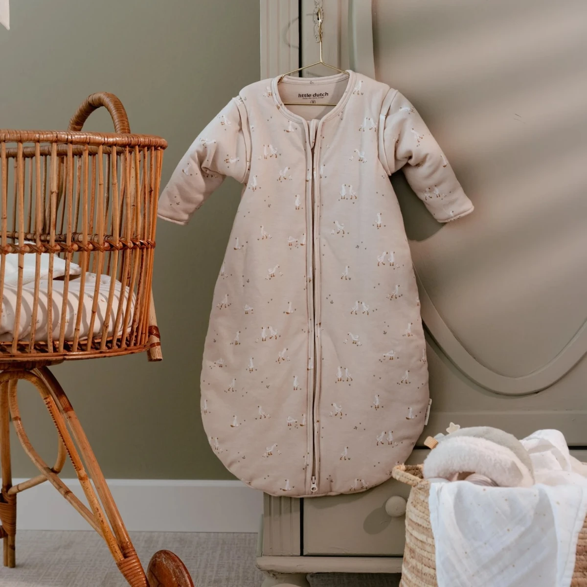 Kryté zipsy v prieramkoch umožňujú ľahké oddelenie rukávov, pokiaľ chcete spací vak používať v teplejšom prostredí bez rukávov. Zips na prednej strane umožňuje ľahké vloženie dieťaťa do spacieho vaku aj prebaľovanie počas spania.