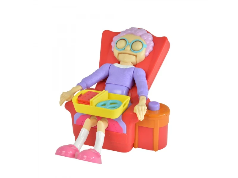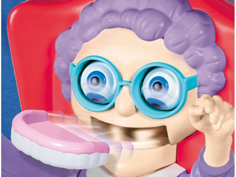 Vložte hornú polovicu tela babky do spodnej polovice tela a kresla. Nasaďte babke zuby. Sklopte babkino kreslo. Vyrovnajte všetky sušienky na podnos... a hra môže začať!