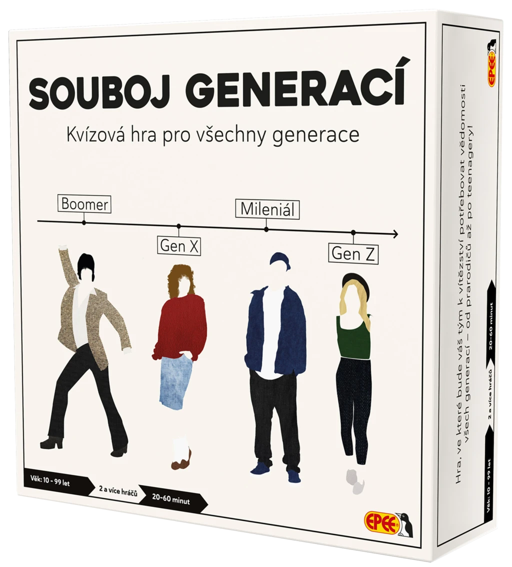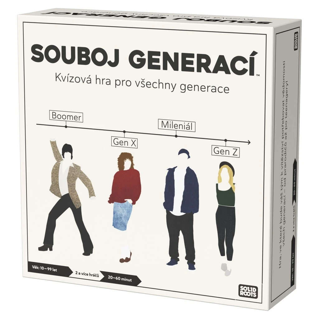 Jedinečná kvízová hra pre dvoch a viacerých hráčov, ktorá preverí vaše znalosti z rôznych oblastí ľudského života. Nie je to tak jednoduché, otázky sa týkajú ako významných udalostí, kultúry alebo aj sveta reklamy, módy a rôznych trendov za posledných skoro sto rokov. Otázky sú rozdelené do štyroch časových skupín - Boomer, generácie X, mileniáli, generácie Z. Hráči môžu hrať samostatne alebo v tímoch. Pozor na karty Výzva, kde ide o preverenie dôvtipu a schopností. Generácie nebojujú proti sebe, „bojujú“ proti sebe jednotlivé časové obdobia. Hráči: 2 a viac. Doba hrania: 20 - 60 minút. Len pre slovenský trh. Pre deti od 10 rokov.