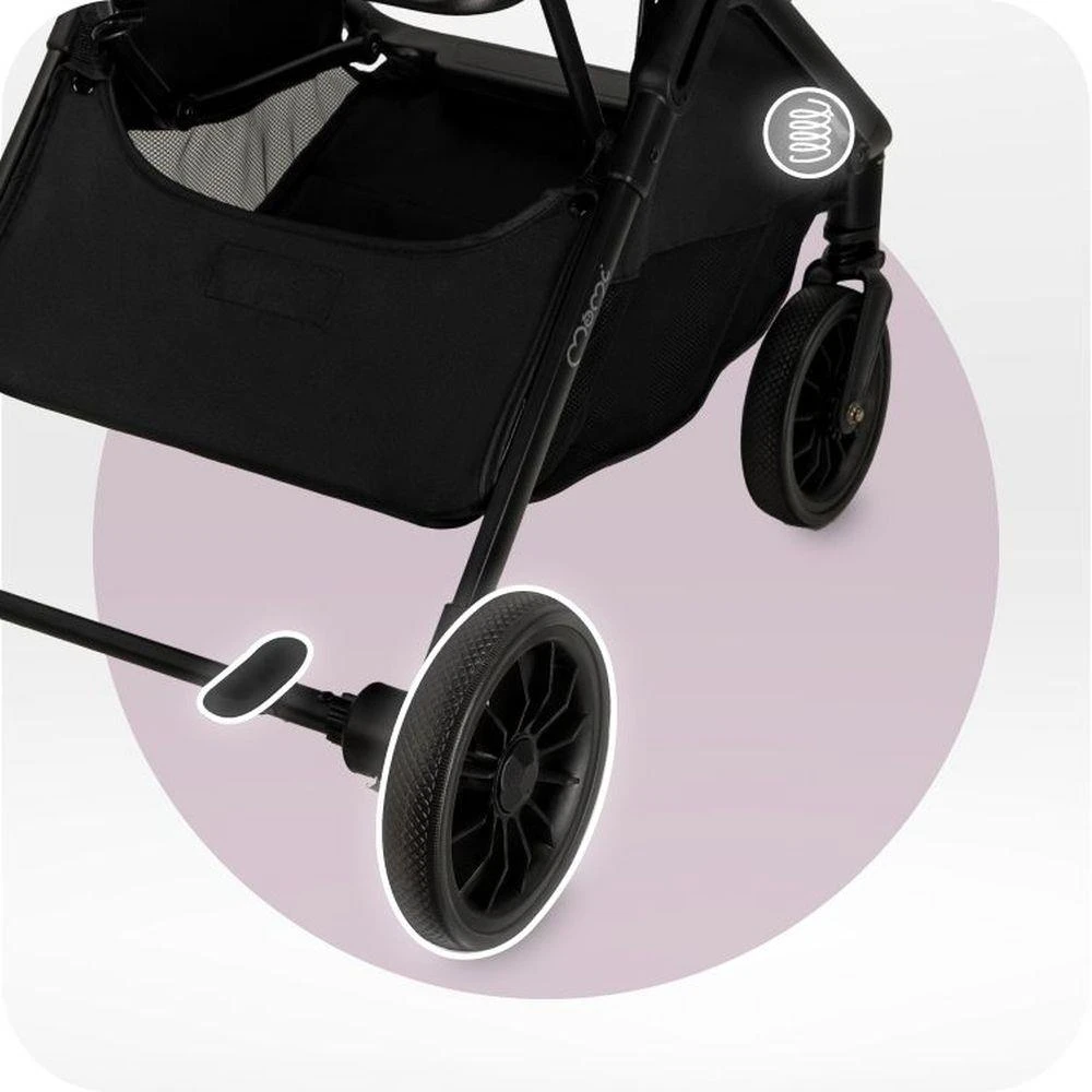 Kočík je vybavený pevnými kolesami z peny EVA odolné proti prepichnutiu, a to v nasledujúcich veľkostiach: V prednej časti sú kolesá s priemerom 6,5“ av zadnej časti 7“, ktoré zaisťujú hladkú jazdu aj v náročnom teréne.