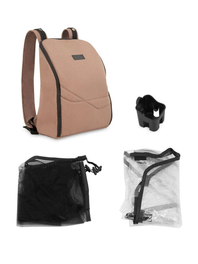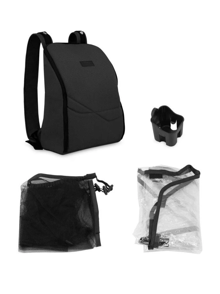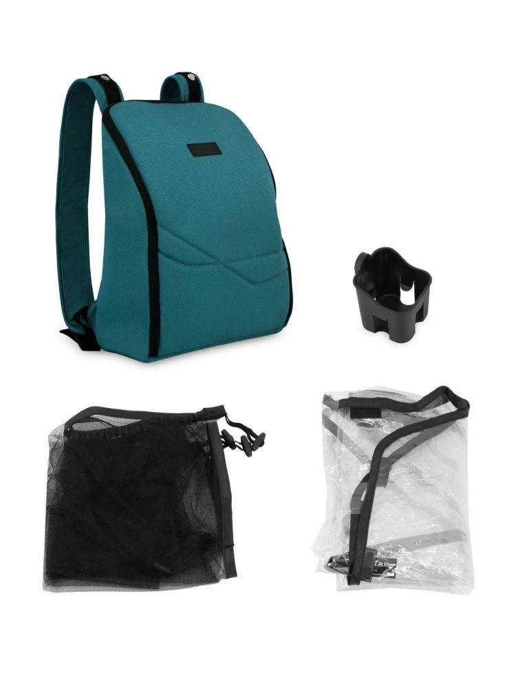 Príslušenstvo v sade - batoh, držiak na nápoje, moskytiéra a pláštenka - spríjemní prechádzku bez ohľadu na počasie. Batoh je možné tiež ľahko zavesiť na rukoväť kočíka.