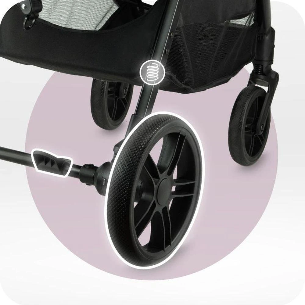Kolesá kočíka MoMi CLARA sú veľké a vyrobené z peny EVA odolné proti prepichnutiu . Všetky 4 kolesá sú navyše odpružené , čo zvyšuje pohodlie malého pasažiera aj rodiča. Predné kolieska je možné zaaretovať.