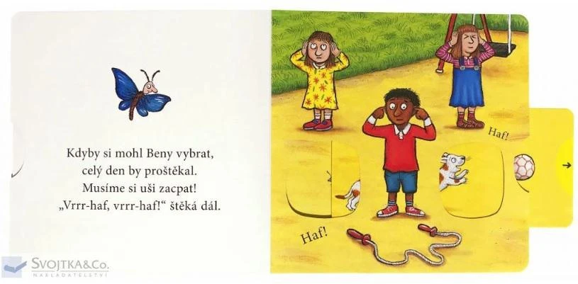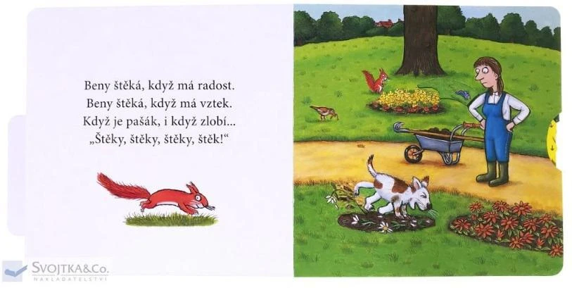 Beny šteká na mačky, na poštára, na deti. Je to veselý psík, ktorý je rád na svete, a nikdy nemá ďaleko k tomu urobiť nejakú lotrovinu. Milé verše o tomto uštekanom šteniatku sprevádzajú obrázky známeho kresliara Axela Schefflera, ilustrátora Gruffala. Obrázky sa dajú oživiť zasunutím prstíka do otvoru a posunutím alebo otočením správnym smerom. Nechajte deti, nech si hravou formou precvičujú jemnú motoriku, a prezerajte si leporelo spolu s nimi.