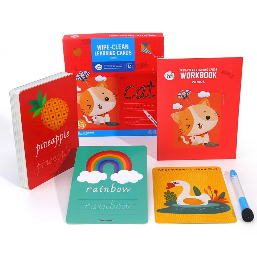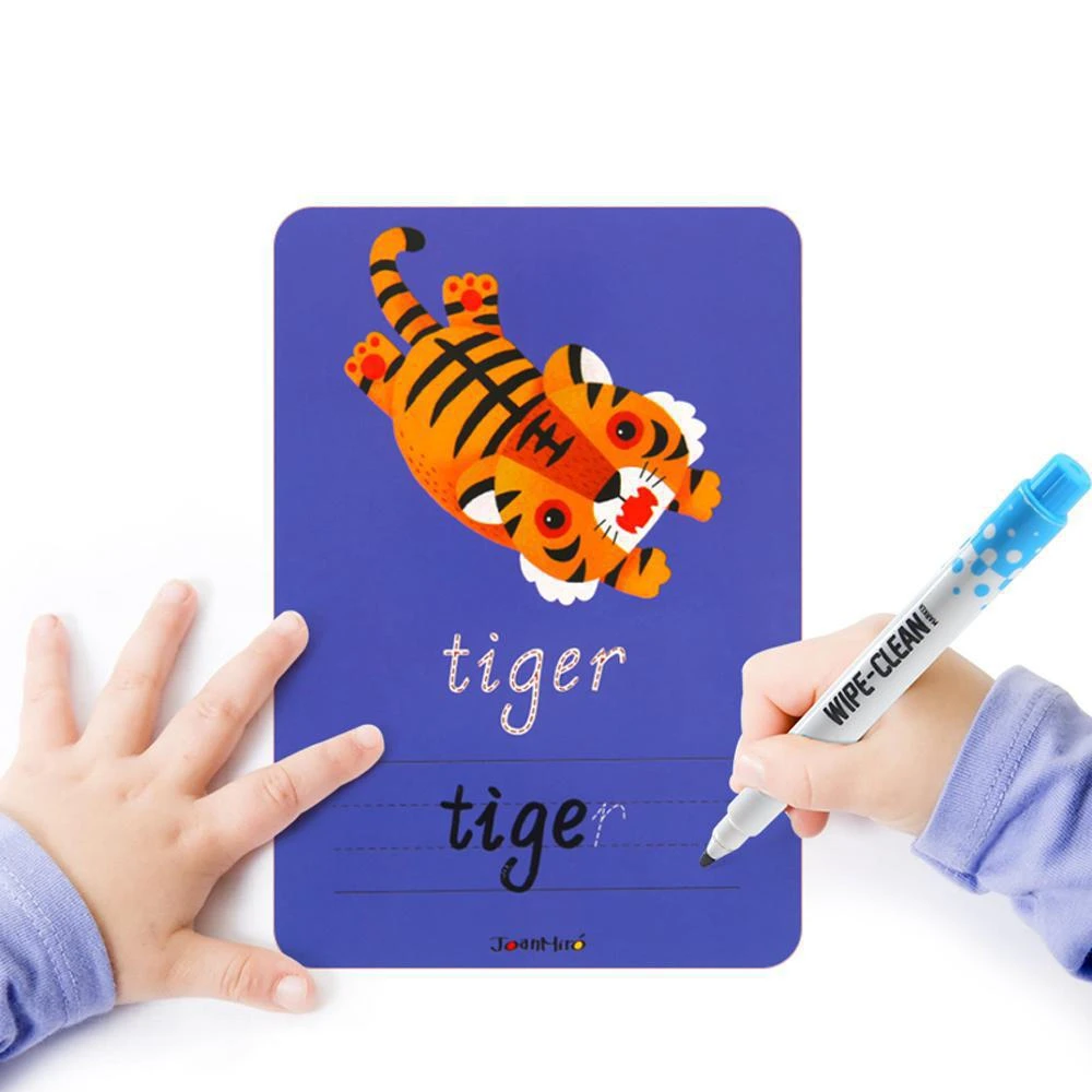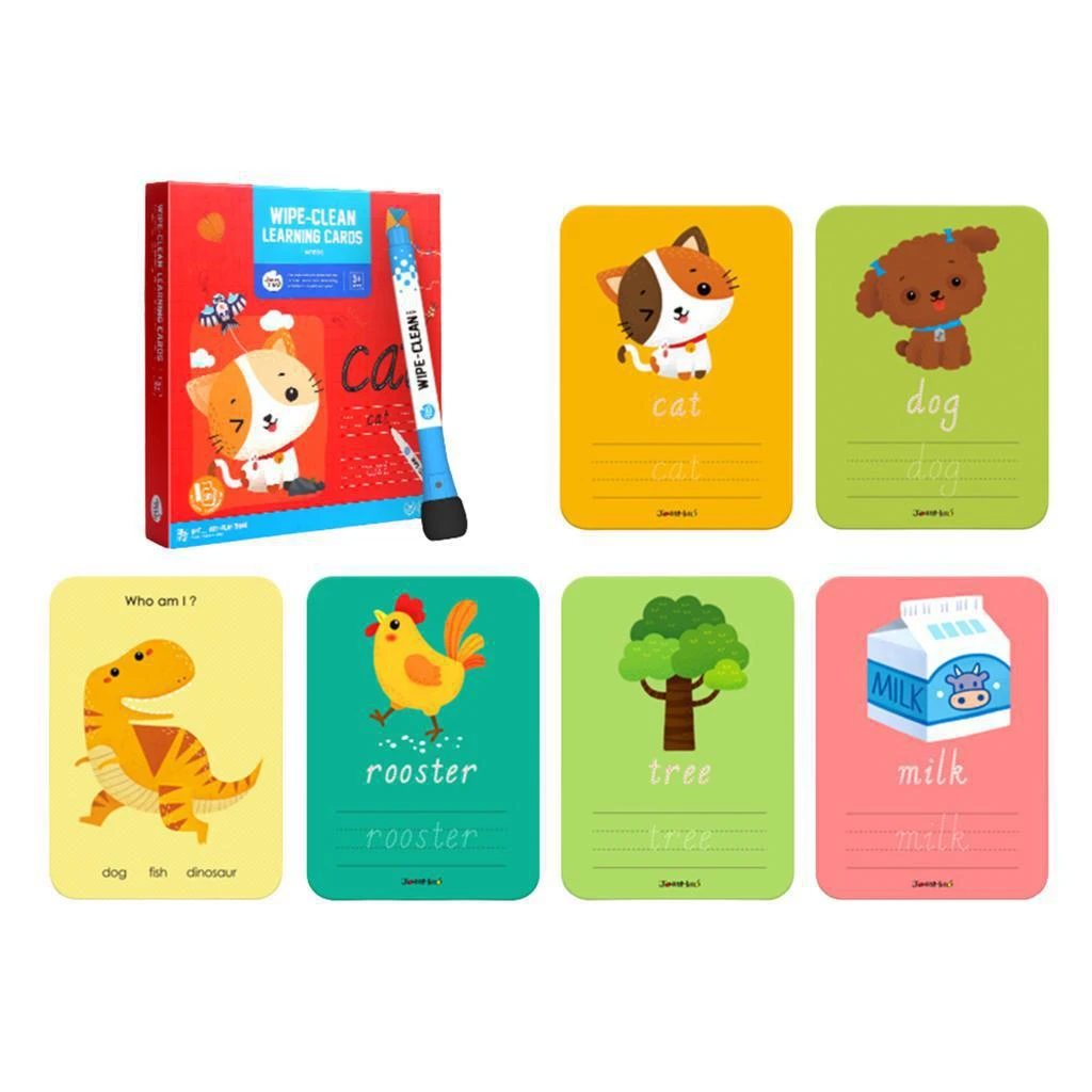 Stieracie edukatívne kartičky Slová EN Stieranie, učenie a zábava v jednom. Táto farebná edukačná sada obsahuje tematické kartičky s anglickými slovami, na ktorých môžete znovu skúšať písanie.
