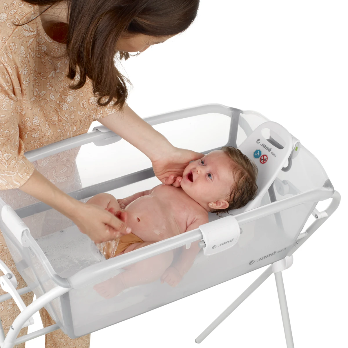 Stojan na vaničku Jané Oasis zdvihne vaničku do pohodlnej výšky, takže môžete bábätko kúpať bez nepríjemného ohýbania. Je určený na prvé mesiace života – od narodenia do doby, než sa dieťa začne samo stavať (cca 12 mesiacov). Nasadenie aj sňatie vaničky je rýchle a jednoduché vďaka uchyteniu cez dva centrálne kotevné body. O bezpečné usadenie vaničky sa starajú bočné zámky. Po kúpaní stojan zložíte do kompaktného tvaru, aby zaberal minimum miesta.