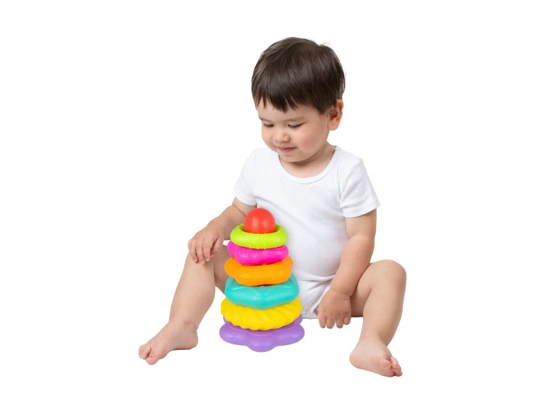 - Učenie hrou: S navliekacími krúžkami si vaše bábätko užije hravú skúsenosť s učením. Učia sa rozpoznávať farby, tvary a sekvencie, čo sú základné poznávacie schopnosti.