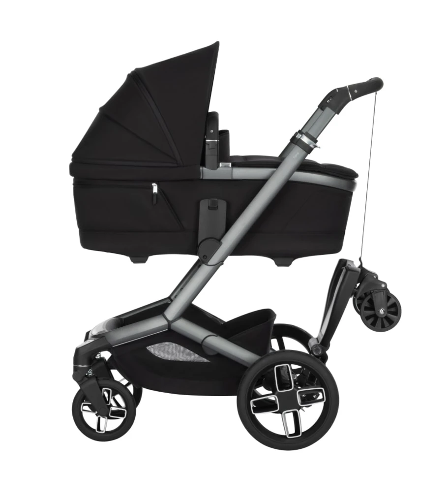 keď stúpadlo nepoužívate, sklopíte ho hore a uchytíte priloženým popruhom k rukoväti kočíka