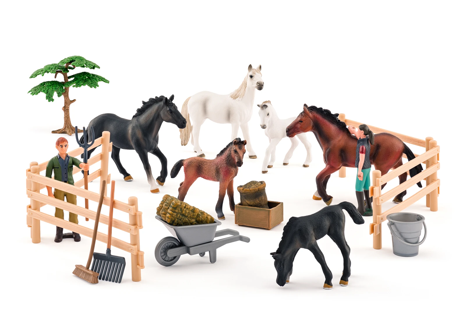 Obsah balenia: 5 figúrok koní (dospelí a žriebätá) 2 postavičky ošetrovateľov 1 strom, ohrada, koliesko, seno, vedro, lopata, hrable a ďalšie príslušenstvo