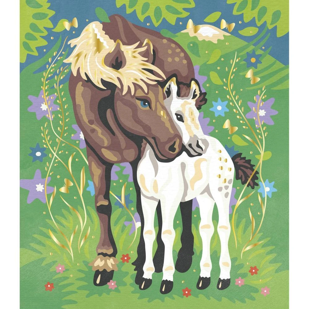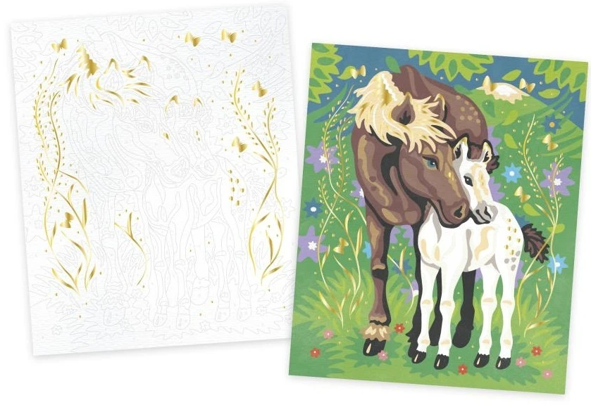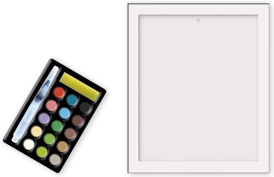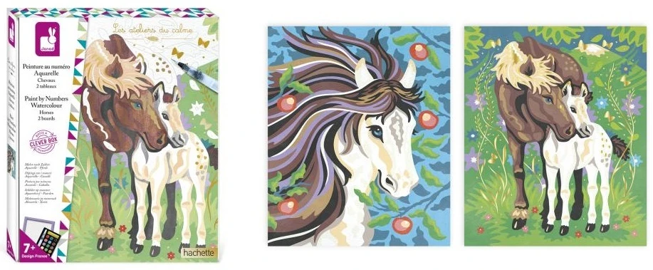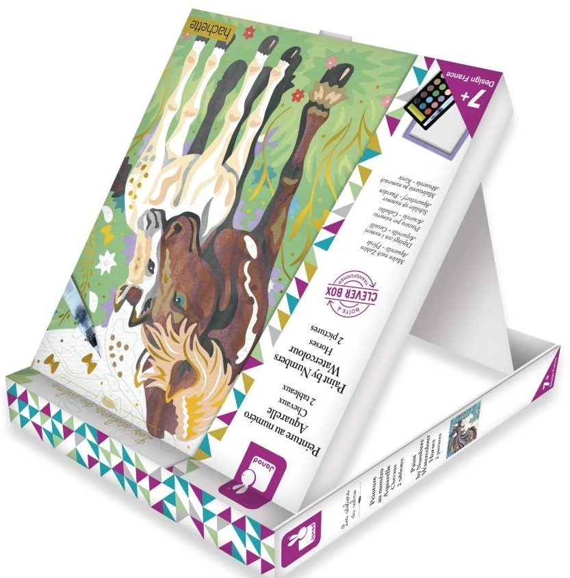 Paleta 15 akvarelových farieb, huba a vodný štetec robia z tejto sady originálnu a ucelenú aktivitu. Vysvetľujúca brožúrka označuje farbu zodpovedajúcu každému číslu. Jeden z dvoch obrazov sa môže pochváliť pozlátenými efektmi, ktoré výtvory ešte viac skrášľujú. Ďalší praktický nápad: škatuľa sa premení na stojan, aby bola činnosť jednoduchšia!