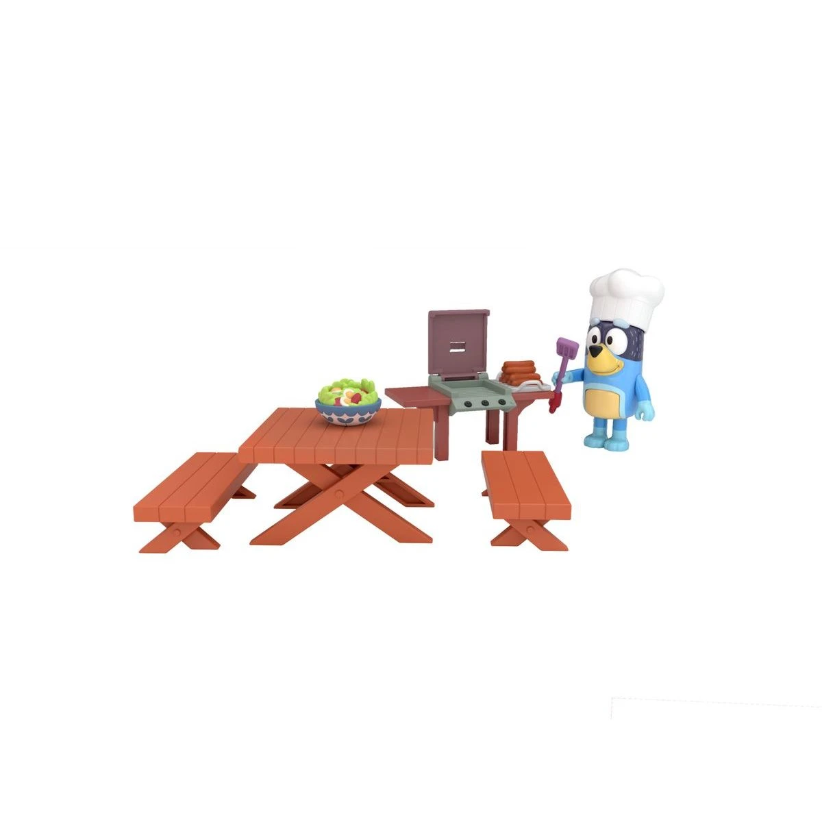 Plastový herný set s motívom záhradnej slávnosti z obľúbeného seriálu Bluey. Balenie obsahuje figúrku otecka Bandita v kuchárskej zástere, záhradný gril s otváracím vekom, piknikový stôl a doplnky v podobe jedla a grilovacieho náčinia.