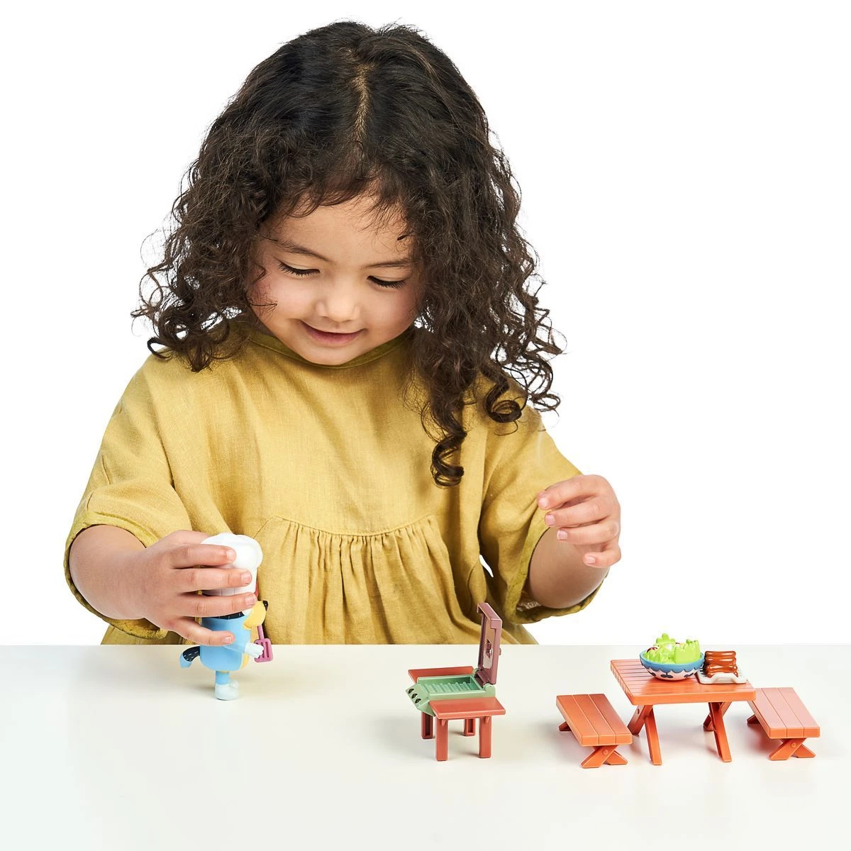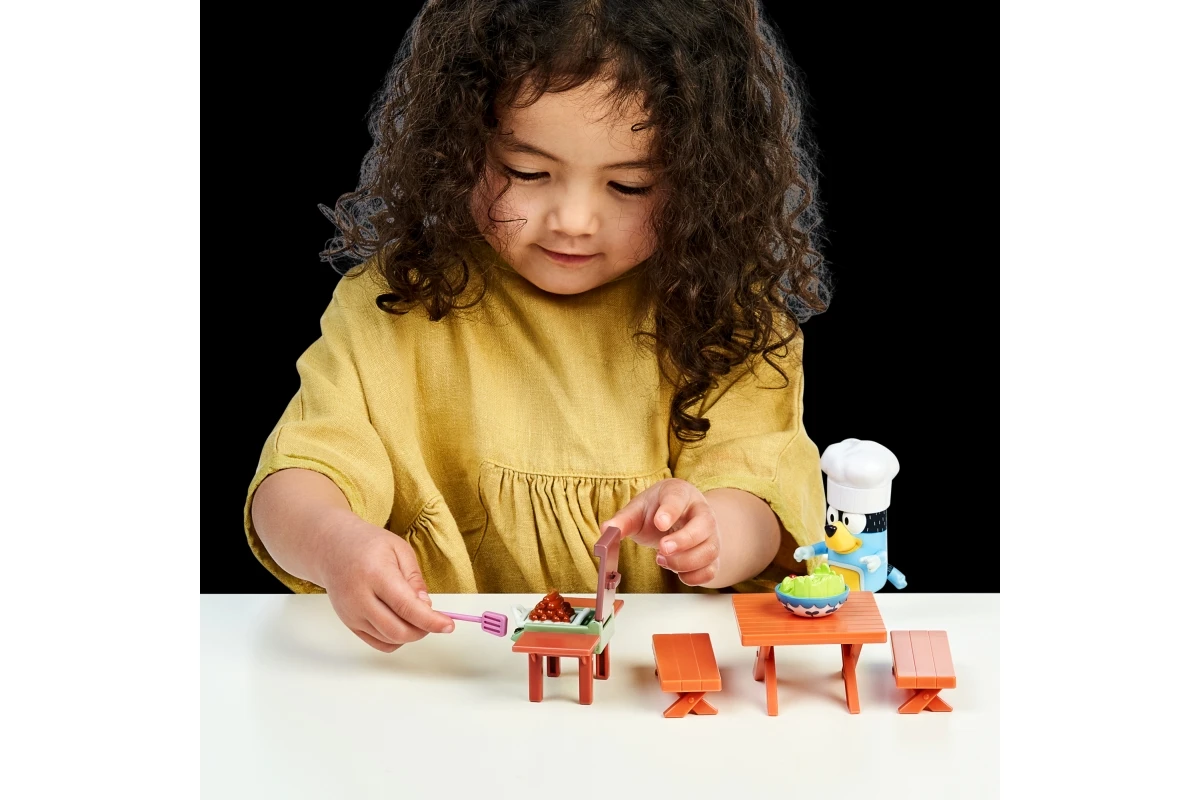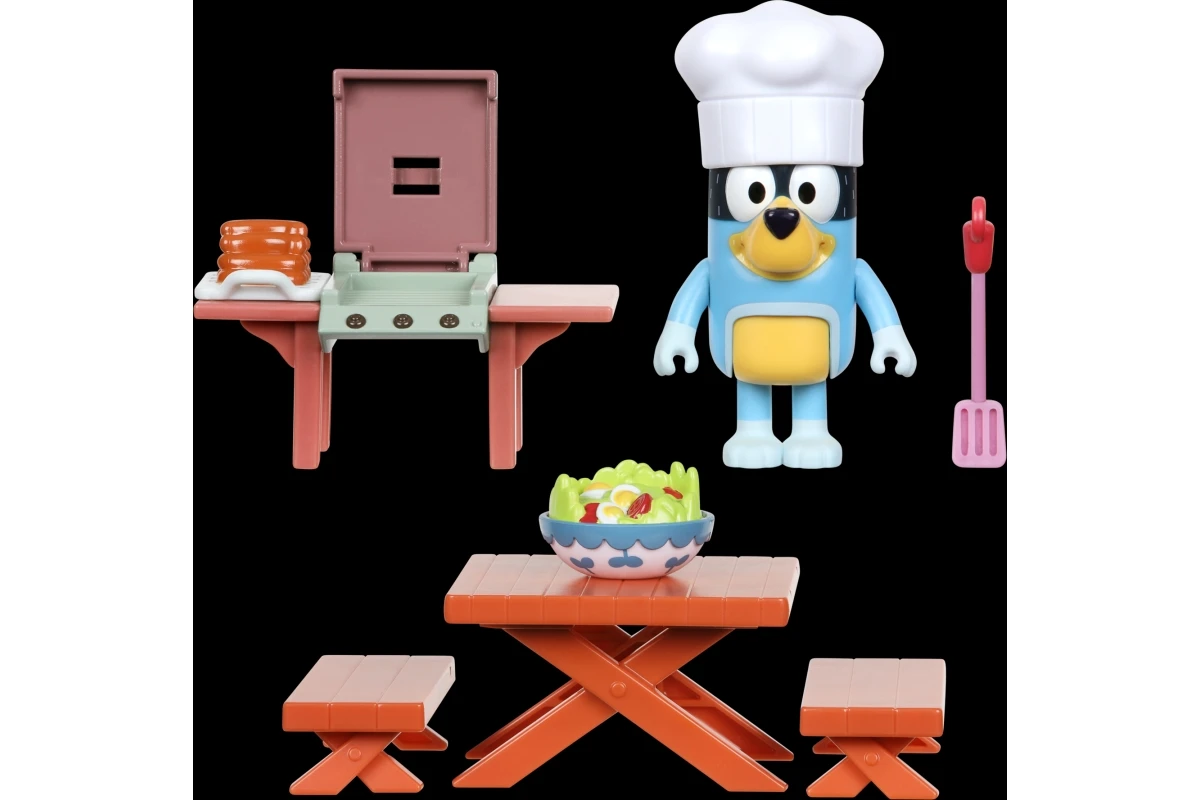 Plastový herný set s motívom záhradnej slávnosti z obľúbeného seriálu Bluey. Balenie obsahuje figúrku otecka Bandita v kuchárskej zástere, záhradný gril s otváracím vekom, piknikový stôl a doplnky v podobe jedla a grilovacieho náčinia. Figúrka má pohyblivé ruky a telo, čo umožňuje ľahkú manipuláciu s náradím pri grile.