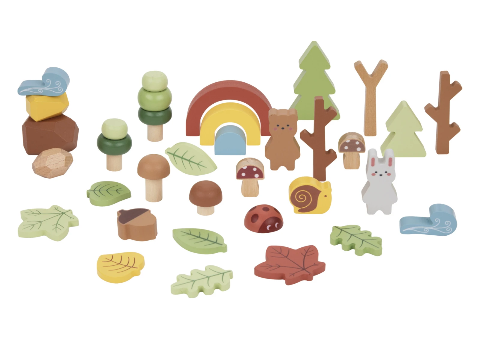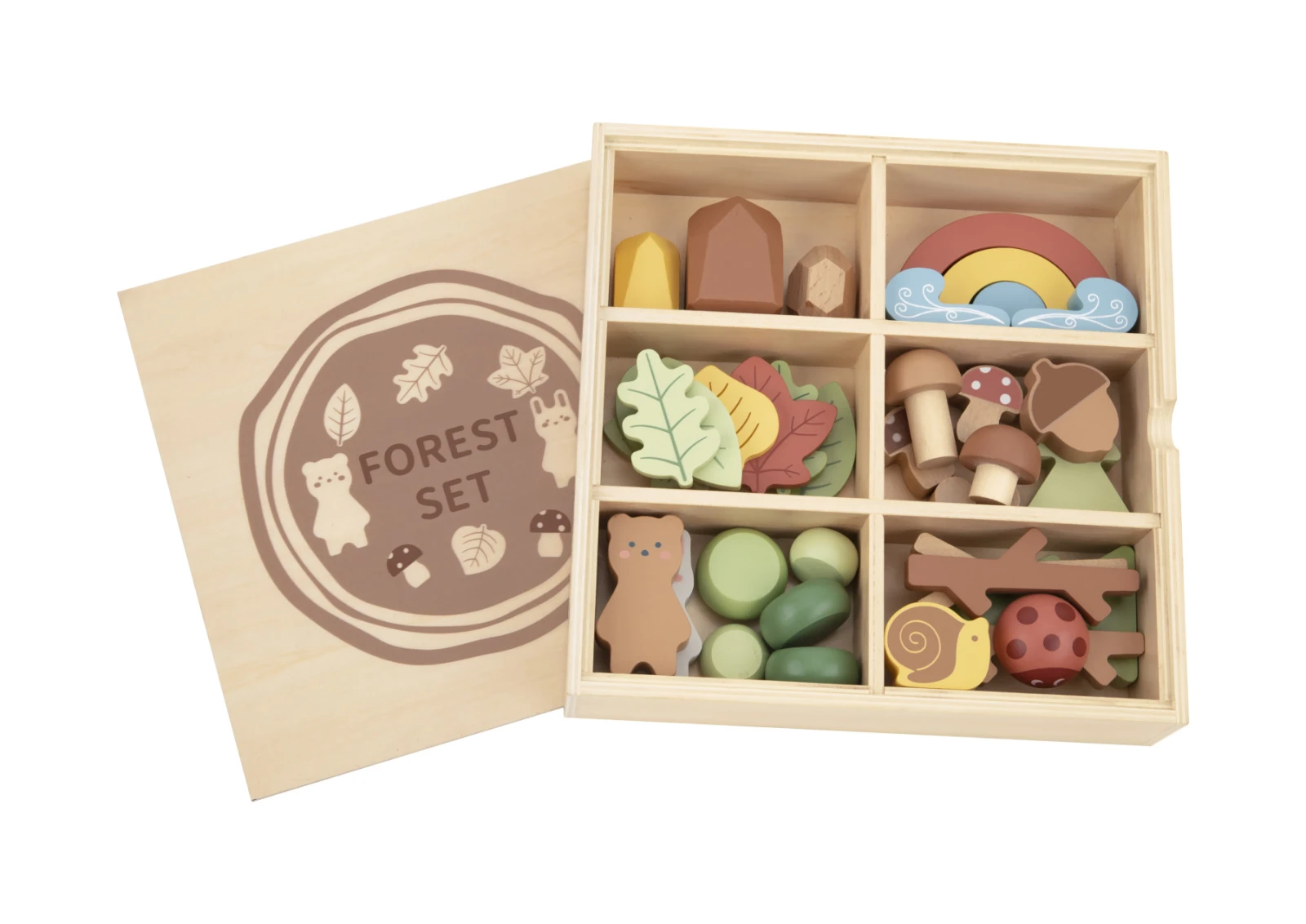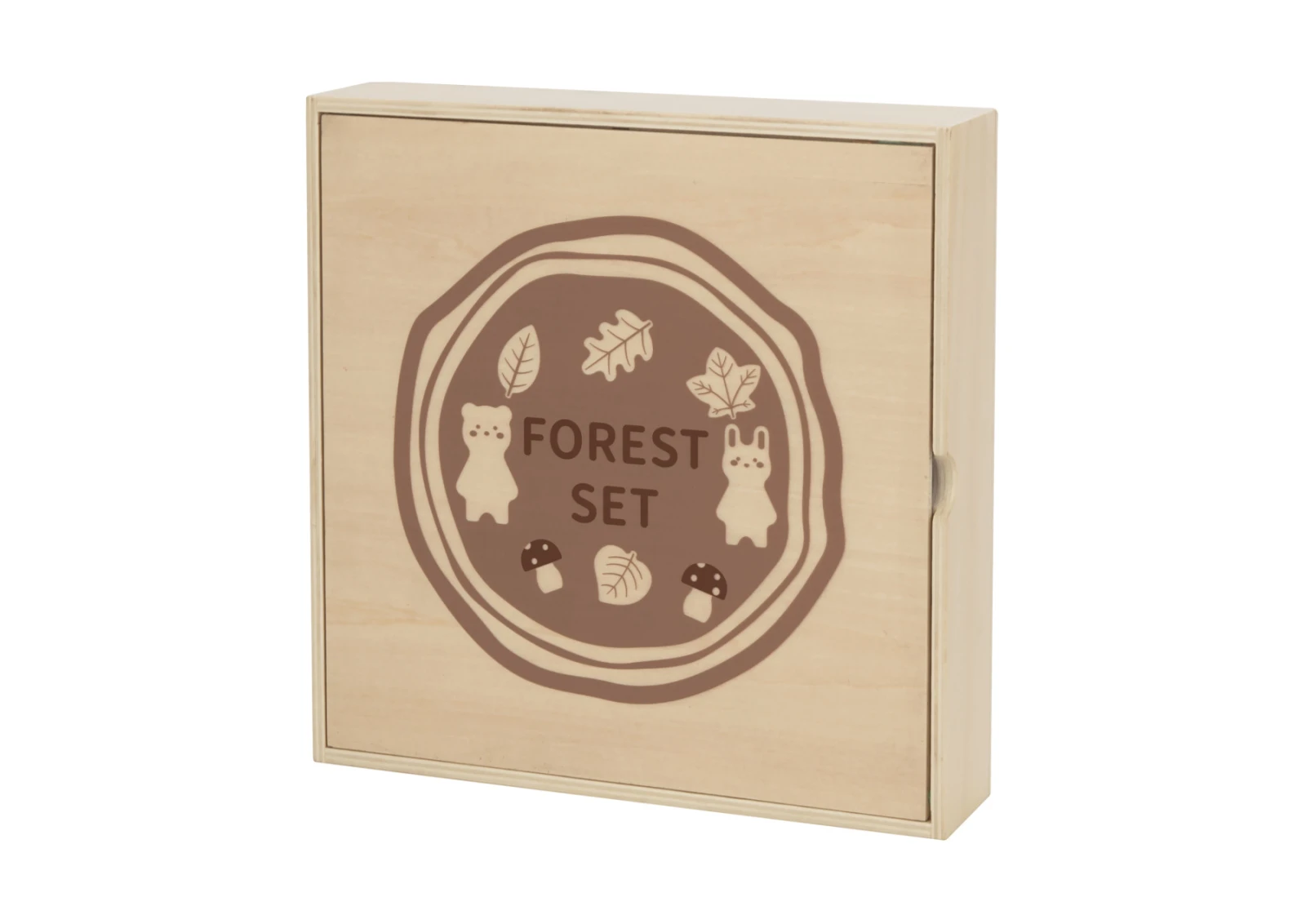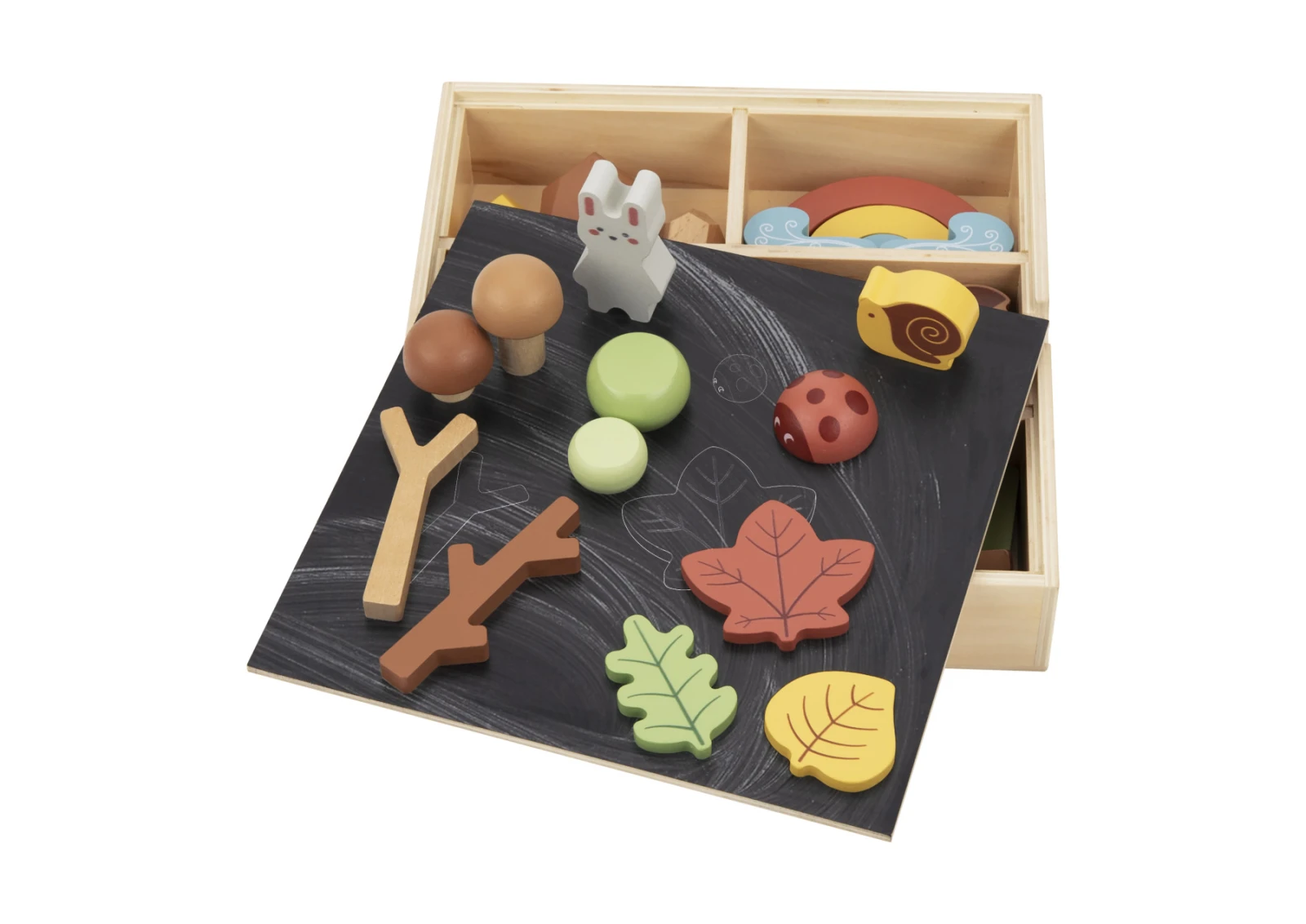 Box obsahuje takmer 40 figúrok – lesné zvieratká, rastliny, stromy, kamene a ďalšie doplnky na budovanie vlastného lesného sveta. Krabička slúži nielen na hranie, ale je zároveň tabuľou na kreslenie kriedou – kreatívne dvojúčelové riešenie.