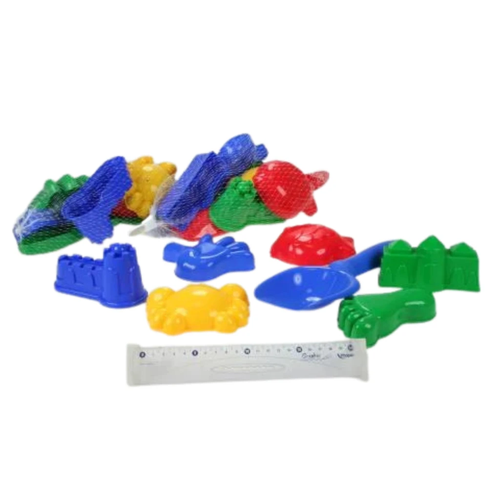 Súprava na piesok obsahuje 6 kusov formičiek rôznych motívov a lopatku. Balené v sieťke. Rozmer balenia cca 30 x 20 x 7 cm.