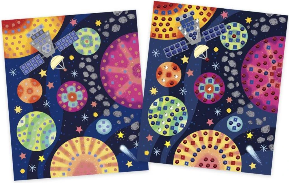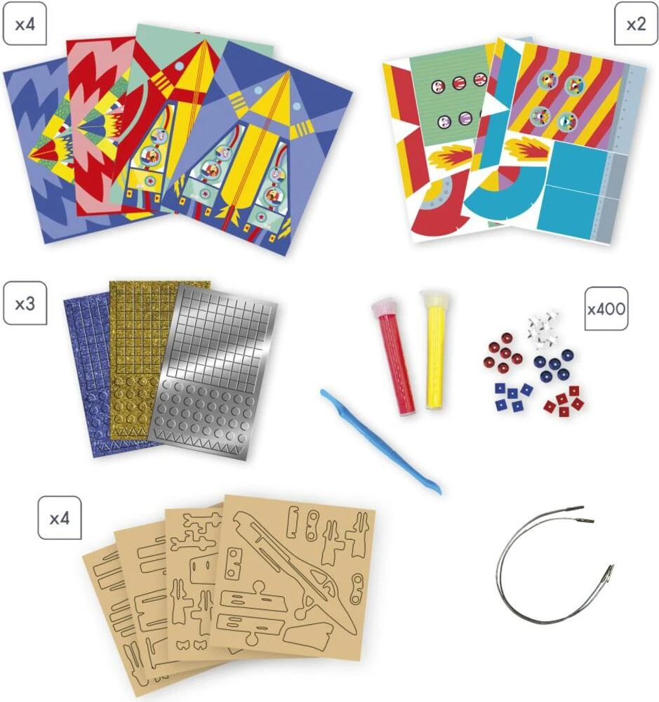 Skúsení nadšenci si môžu vyrobiť 4 papierové lietadlá, 1 model lietadla a 2 papierové rakety s odpaľovacím zariadením. Zatiaľ čo tí starostlivejší sa zabavia zdobením 2 samolepiacich obrázkov flitrami, 2 tabúľ s farebným pieskom a 2 masiek s mozaikami. K dispozícii je brožúra s pokynmi, ktorá bude začínajúcich remeselníkov sprevádzať na každom kroku.